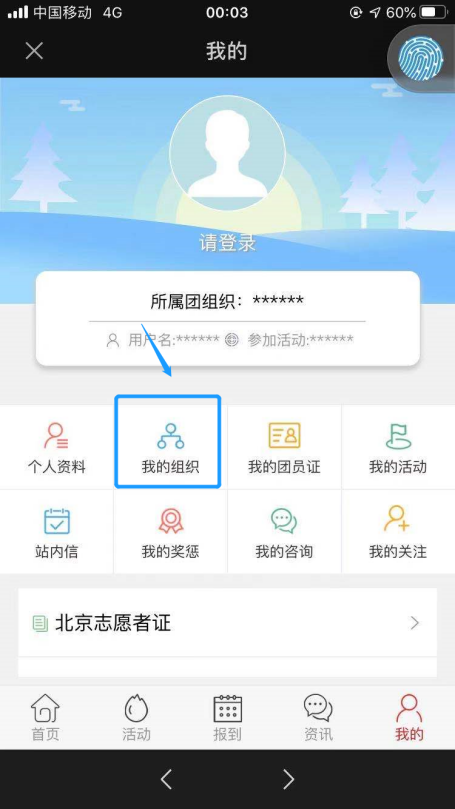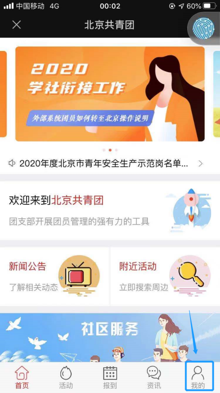 1.从“青春北京”公众号登录“北京共青团“系统后,在底栏中选择“我的”。
