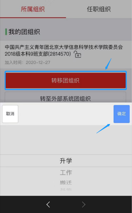 3.在“我的组织”页面中,选择“转移团组织”,原因选择“升学”,确定。