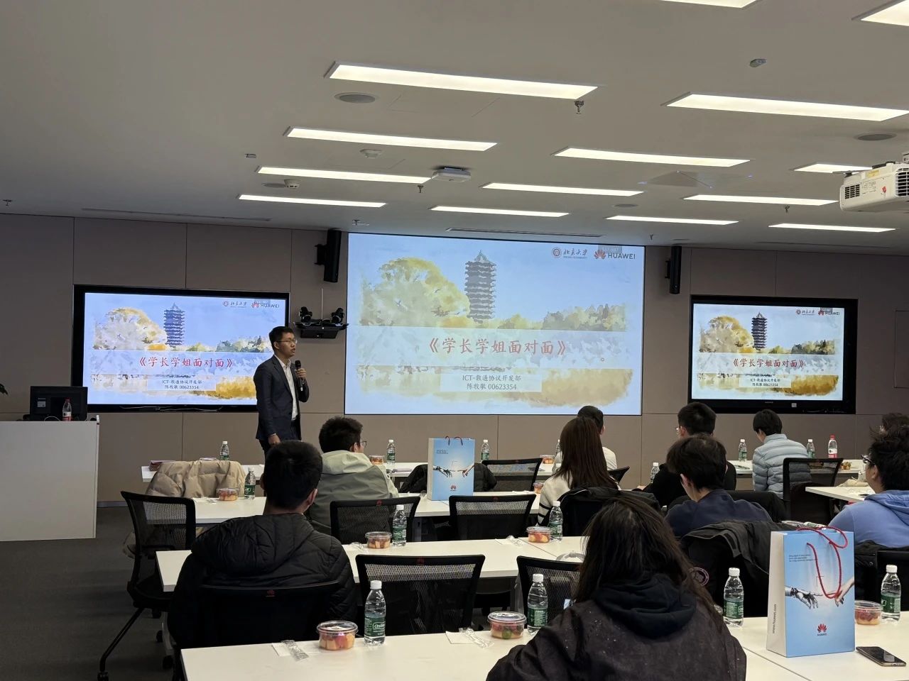 参观结束后,同学们移步至会议室与华为北京研究所工作人员座谈交流。华为北研所招聘经理王松、陈阳和北京大学校友、华为北研所职员陈牧歌、伏臻参与交流。
