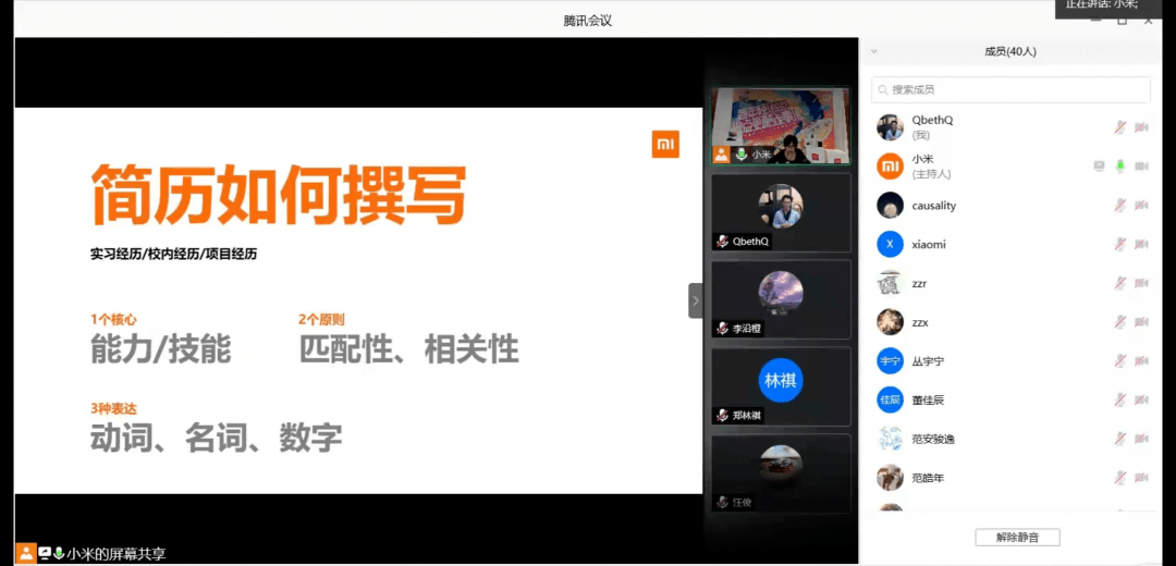 最后,小米公司张静媛结合从事人力工作的经验,向同学们介绍了就业规划要点,着重分享了对就业简历问题的思考,提出:简历中应当突显针对性的能力与潜质;简历的四要素—匹配度,结构,内容和设计要仔细谋划;要结合自身特色,对简历进行优化升级;要注意避免部分经常出现的问题。通过案例分析,增进了同学们对职业发展、就业程序的认识。