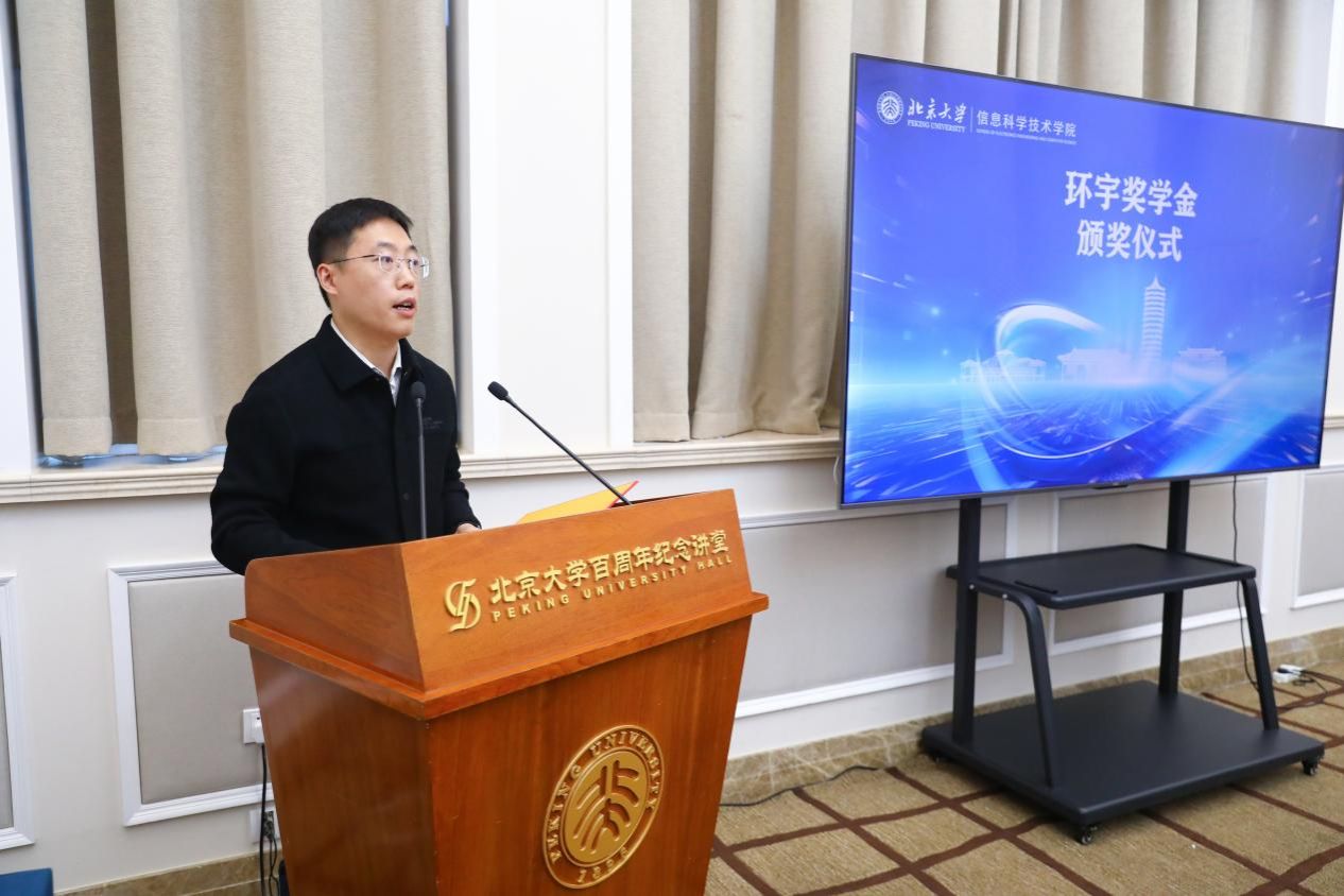 学院首届“环宇奖学金”颁奖仪式环节,学院党委副书记贾方健宣读表彰决定。为落实立德树人根本任务,激励学生成长成才该奖学金项目在“北京大学环宇教育发展计划”基金支持下设立,奖励在学术研究、科技创新、社会实践、综合素质等方面表现突出的优秀本科生。经过个人申报、班级推荐和学院审核,最终评选出35名优秀学生获得首届“环宇奖学金”。