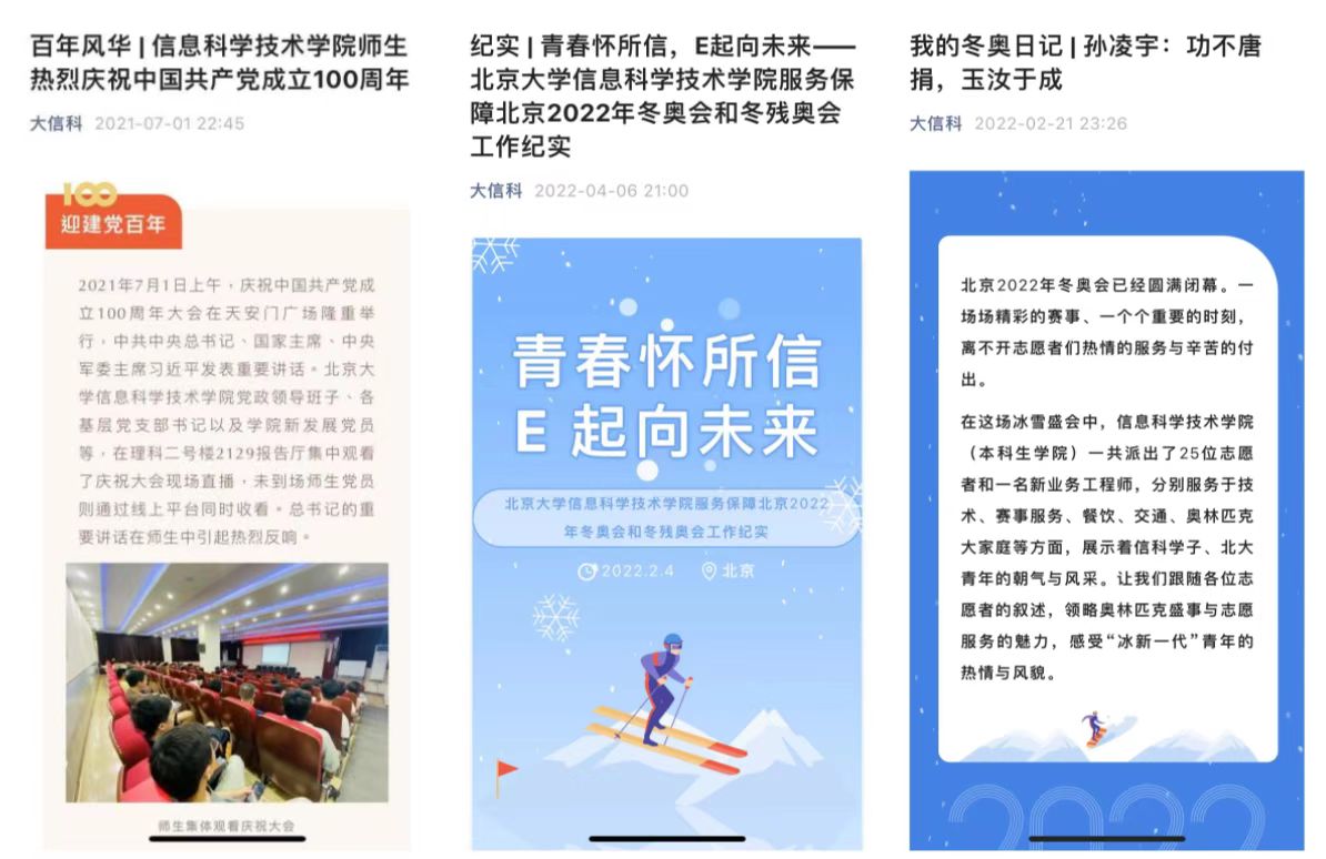同时,宣传部还协同各部门,对各大事件、活动中信科人的风采进行记录,推出建党100周年系列推送、冬奥志愿者系列推送等,讲好信科青年故事。