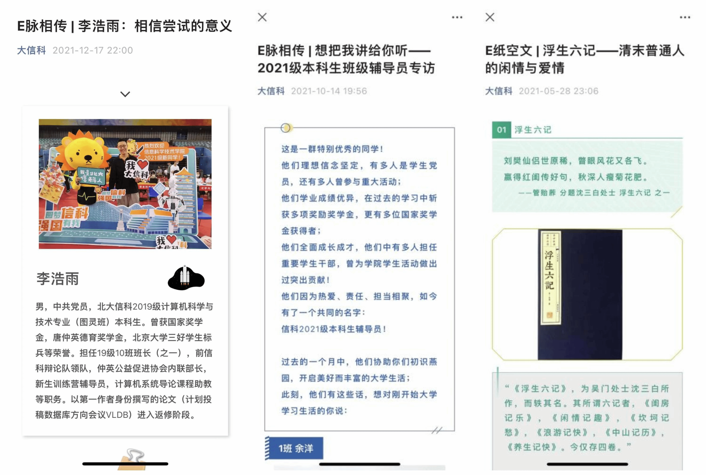 自2014年建立“北大信科团委”微信公众号,2016年信科公众号正式合并为“大信科”公众平台后,宣传部负责管理运营该微信平台,在平台上推出“E脉相传”、“E纸空文”等特色栏目,为信科同学们提供大学生活所需的各类信息和活动宣传。