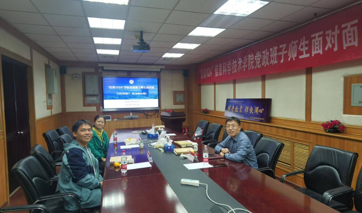 20241024日中午,正值“1024程序员节”,信息科学技术学院在理科二号楼2111会议室举办2024年第十二期(总第26期)“信谈1024”学院党政班子师生面对面之港澳台及留学生专题活动,本次座谈会采取群体座谈的形式,对报名同学们的问题进行全面交流答疑解惑。学院教学副院长陆俊林、党委副书记贾方健,成功报名的学生代表们参加了本次座谈。活动由学院学工办主任李子奇主持。
