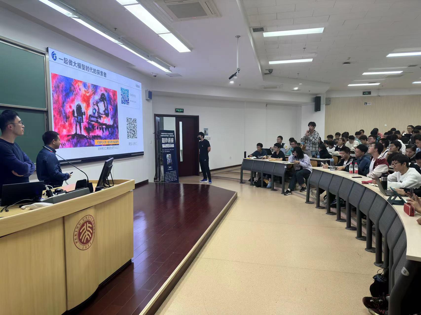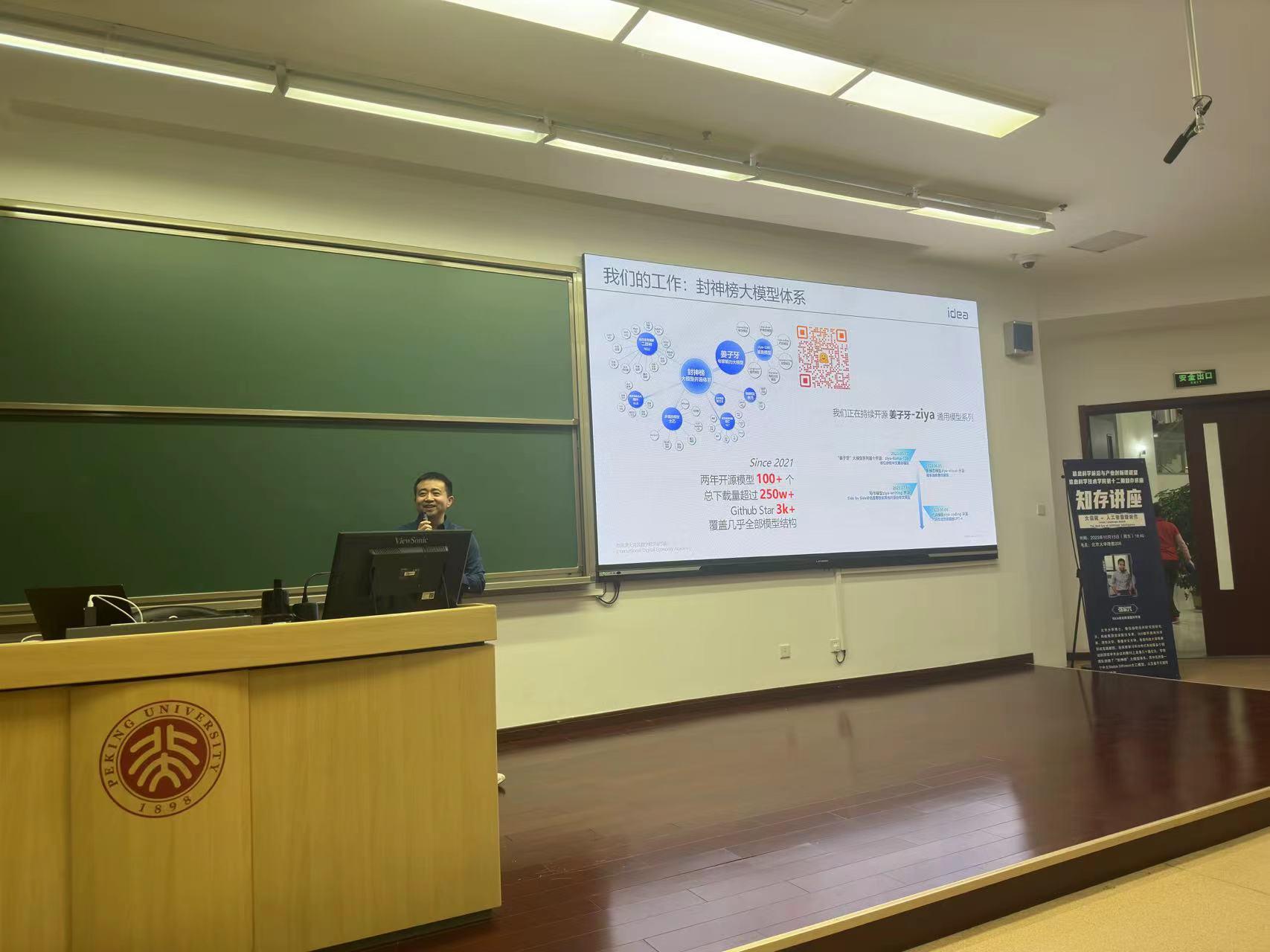 2023年10月13日晚,信息科学技术学院第十二期“知存讲座”暨信息科学前沿与产业创新课程在理科教学楼208教室顺利举办。北大校友、IDEA讲席科学家,曾任微软亚洲研究院研究员的张家兴老师受邀进行了以“大模型——人工智能新时代”为主题的分享,400余名师生到场聆听。信息科学技术学院副院长王润声老师主持了本次活动。