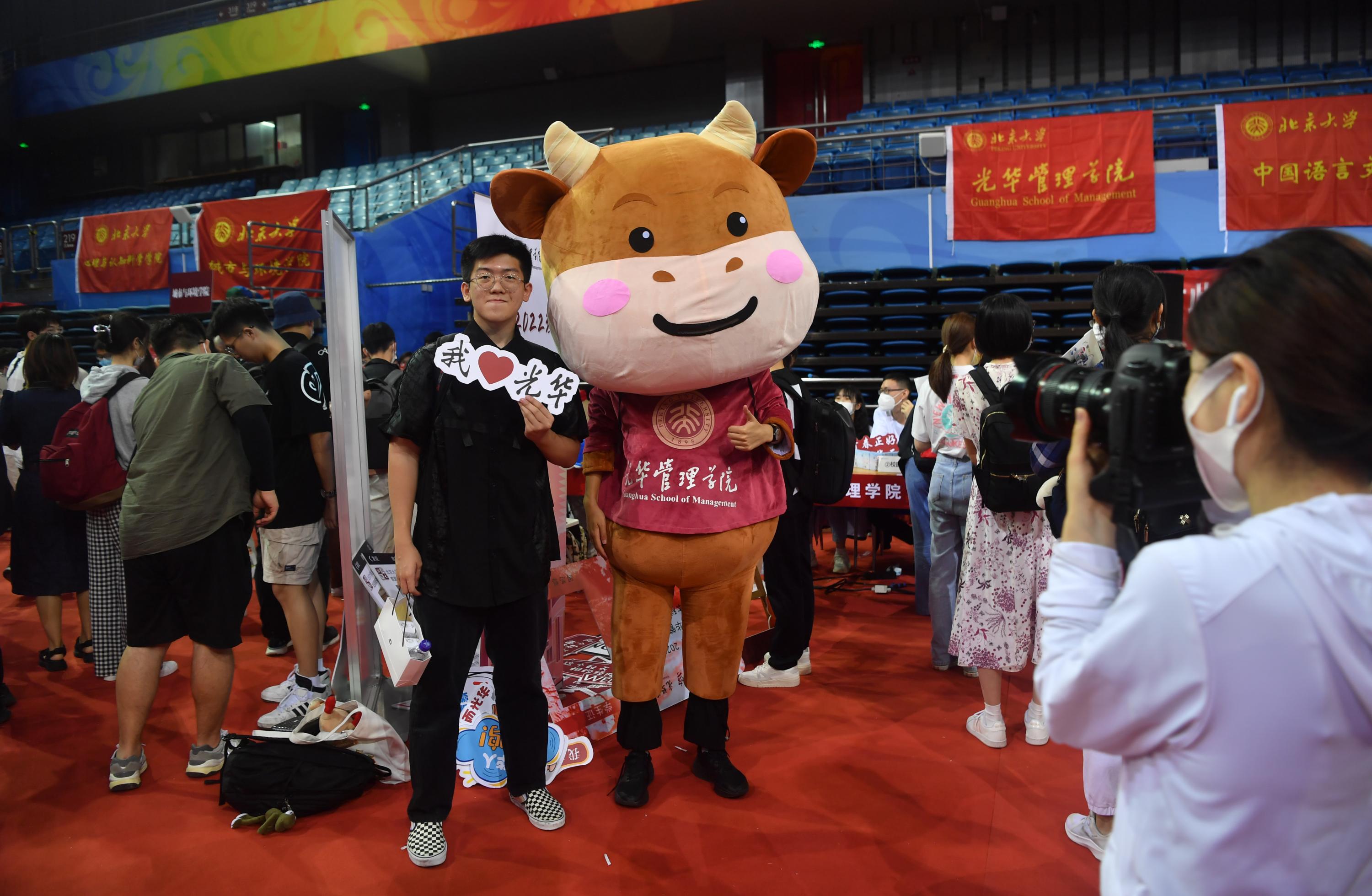 报到现场,北京大学30余个院系以及体育教学部、学生工作部等部门展位依次排开,工作人员和志愿者在展位前迎接新生。各大院系的吉祥物举手欢迎,身穿各自院系服装的志愿者们向新生介绍并引导学生报到、领取新生大礼包。