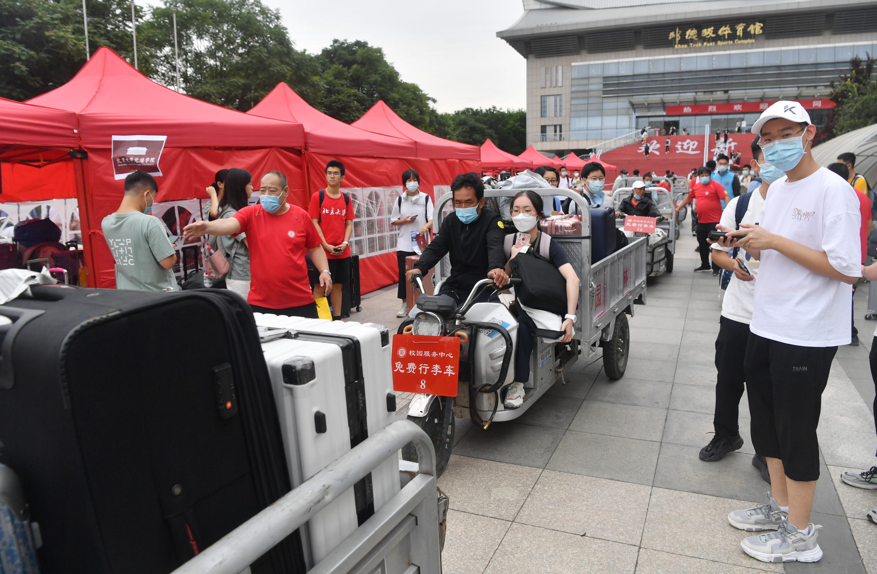 校内有专门的工作人员帮助学生运送行李。新京报记者 李木易 摄