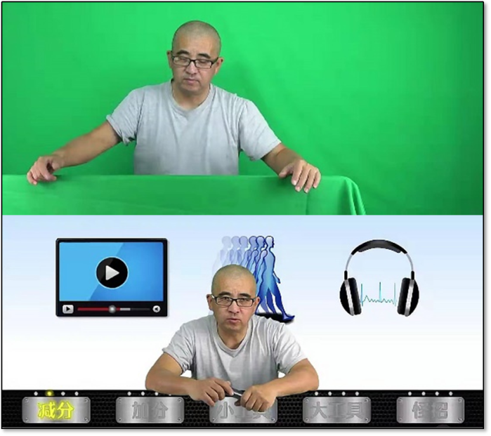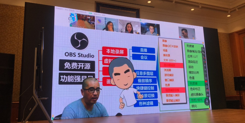 陈江在ClassIn的直播讲座中使用绿幕抠像并演示虚拟角色的现场舞台效果,2020年