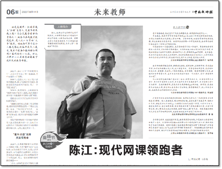 2022年是陈江进入北大的第三十一年,执教生涯的第二十一年。这一年,《中国教师报》将“未来教师”这一荣誉颁给陈江,致敬他在教育信息化浪潮中始终敢为人先——2013年,被定义为“中国慕课元年”,北京大学开设了第一批慕课,其中有他的一门课程;2018年,他在北大开设了电子游戏的概论课,成为“网红教授”;2020年,疫情突发,上网课成为“停课不停学”的不二选择,他的课被中新社等主流媒体称为“教科书级”网课。