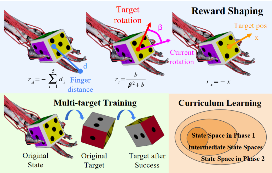 比赛的核心竞争集中在寻找一个能够适应特殊手部控制模型以及参数随机化的策略,也就是说,因材施教地指导人工智能自主学习。对耿逸然和安博施来说,在特定的问题背景中选取合适的方法成为最大的挑战。在经历了几次尝试的失败后,他们决定采用强化学习框架来在模拟器里训练他们的策略,通过奖励塑造(Reward Shaping)、课程学习(Curriculum Learning)和多目标训练(Multi-target Training)等技巧来提高训练后的策略的性能。