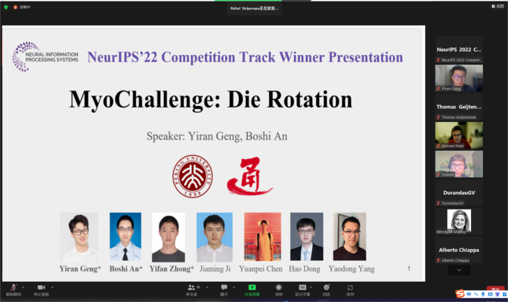 在人工智能顶级会议NeurIPS 2022(第36届神经信息处理系统大会)上,由北京大学人工智能研究院杨耀东助理教授、计算机学院前沿计算研究中心董豪助理教授共同指导,北京大学信息科学技术学院2020级图灵班本科生耿逸然和安博施作为共同第一作者获得MyoChallenge挑战赛Die Reorientation赛道冠军。