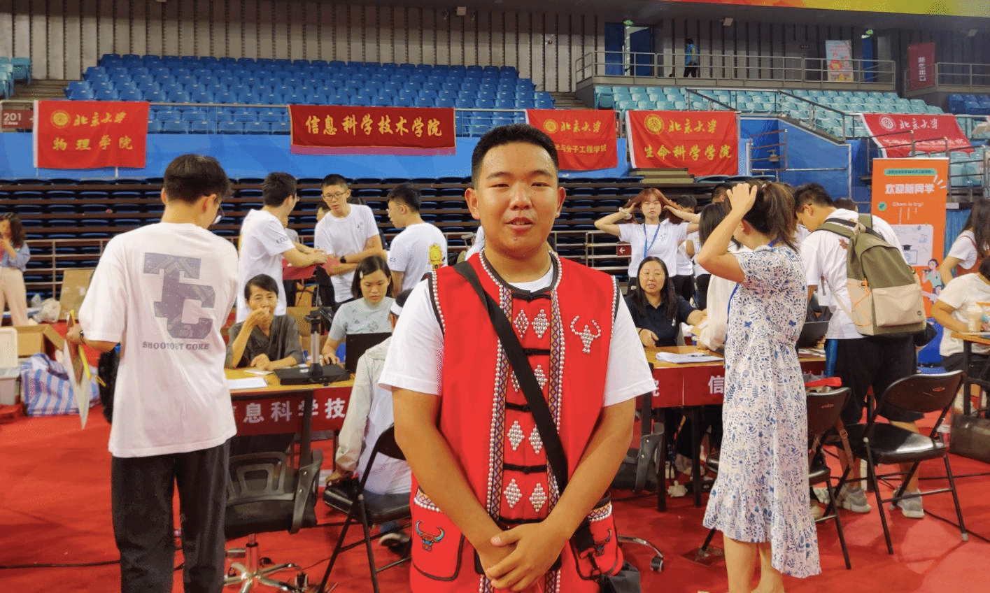 8月19日,北京大学4483名2023级本科新生报到,身着鲜红色佤族服装的陈浩伟在人群中显得很耀眼。