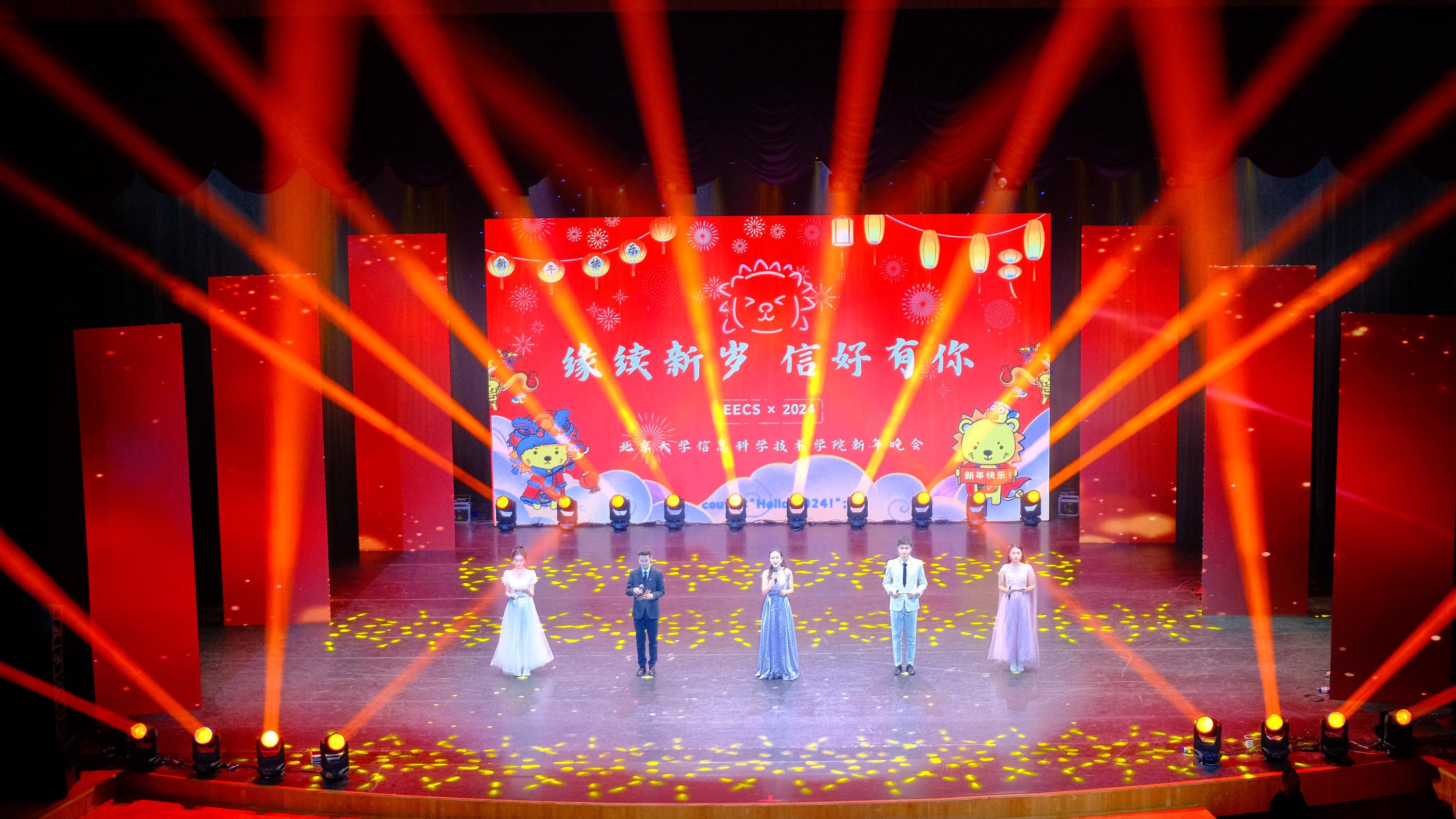 2023年12月18日晚,北京大学信息科学技术学院“缘续新岁,信好有你”2024新年晚会在百周年纪念讲堂观众厅隆重举行。信息科学技术学院党委书记严敏杰、院长侯士敏及党政班子全体成员参加晚会,北京大学保卫部、电子学院、计算机学院、集成电路学院等校内单位及兄弟院系代表,相关捐赠企业代表、校友代表与全院师生欢聚一堂,共享精彩纷呈的视听盛宴,迎接全新一年的到来。