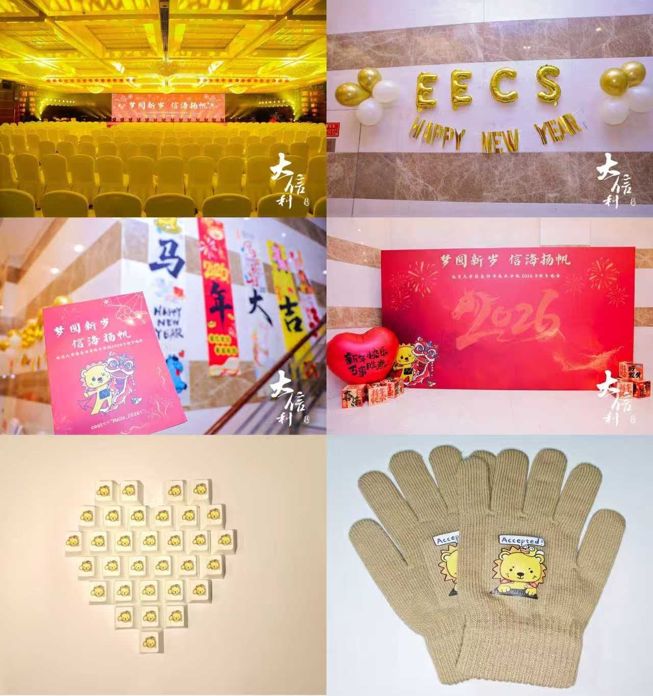 在晚会开始前,学院精心准备了印有吉祥物“攻城狮”的定制手套与键帽,让老师同学们感受到了独属于信科人的浪漫。现场还设置了签名墙供师生打卡留念。时值新年将近,学院也在晚会现场为老师同学们提供了热腾腾的多种口味的饺子,让每一位到场的观众都感受到新年的氛围和学院的关怀。