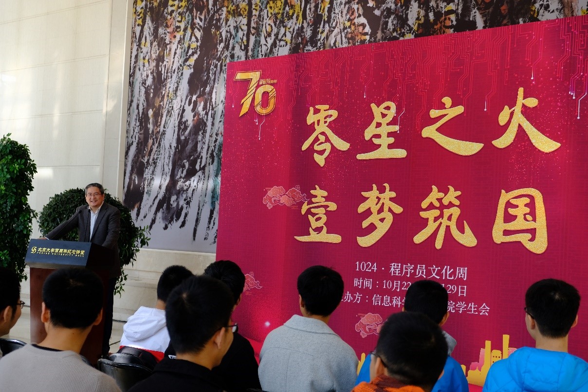 谢冰老师指出,程序员文化是信科学院的一种独特文化;程序员身上有一种重要的精神气质,应该是我们北大信科程序员们都该有的,那就是“爱国主义”。2019年是新中国成立70周年,是中华民族坚定迈向伟大复兴的重要历史关口。在当下、乃至未来很长的一段时期,信息科学技术都将是人类工业革命和经济发展的主要驱动力。北大信息学科历史辉煌,在我国信息科学技术发展进程中贡献了多个“第一”,包括第一台原子钟、第一台百万次电子计算机、第一块大规模集成电路1024位随机存储器、第一个激光照排系统,第一个大规模商用指纹识别系统,第一个大型软件工程环境等等都诞生在北大,也打造了新中国第一批程序员队伍。这些工作都和国家需要相符合,程序员们都为国家发展建立了功勋。北大信科人应始终牢记肩头的使命,开拓创新,为国家,为人民,为人类做出积极的贡献。习总书记说:“爱国,是人世间最深层、最持久的情感,是一个人立德之源、立功之本”。120多年来,北大走出了一代又一代民族的脊梁、国家的精英;今天的你们不仅背负着父母的期待,更承载着国家的未来。作为北大信科人,不仅要能写程序、造芯片,能“集成天下、网络八方”,更要树立“信息科学,强国兴邦”的远大志向,保有北大人“眼底未名水,胸中黄河月”的家国情怀。不仅要能埋头学习,认真科研,更要去思考如何担当大任,将自己的命运与国家民族的命运的紧密相连。今天举办1024程序员文化节,就是希望同学们能不忘初心,传承信科人爱国报国的精神,发扬“信息科学,强国兴邦”的信科文化,争做时代追梦者和圆梦人。