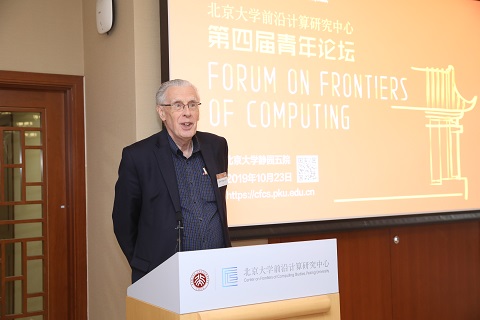 在论坛开幕式上,作为前沿计算研究中心主任及“图灵班”发起人之一,图灵奖得主、中国科学院外籍院士 John Hopcroft 教授代表中心欢迎大家的到来。他比较了中美两国在学生培养上的差异,介绍了在北大成立前沿计算研究中心的背景和初衷,高度肯定了北大学生的优异表现,欢迎更多优秀的教职人员加入中心,并对中心的未来发展寄予厚望。