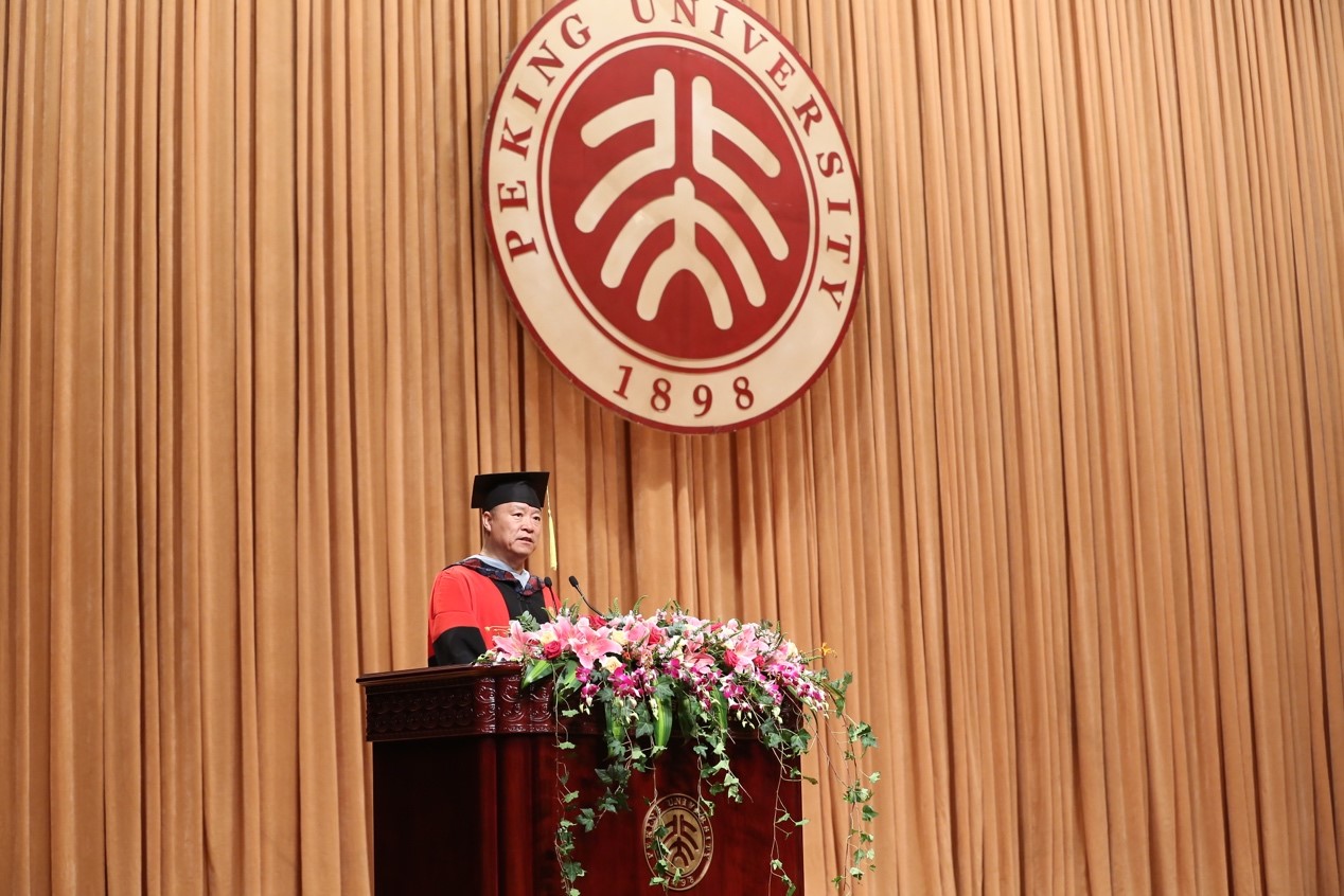 今年,学院广泛邀请了学生家长前来参加毕业典礼。学生家长代表王静先生表示在北大看到了孩子脱胎换骨般的进步和提高,并且成为一名知识丰富、有抱负的有用之材,更是有社会责任感、有担当的时代先锋。他感谢学校和学院对同学们的教导和培养,并叮嘱同学们要心存感恩之心、始终铭记“眼底未名水,胸中黄河月”的北大魂。最后,他勉励毕业生们传承北大精神,科学创新、勇攀高峰,为谱写绚烂的人生去努力、为早日实现中华民族伟大复兴中国梦去奋斗、为中华让世界震惊去拼博。