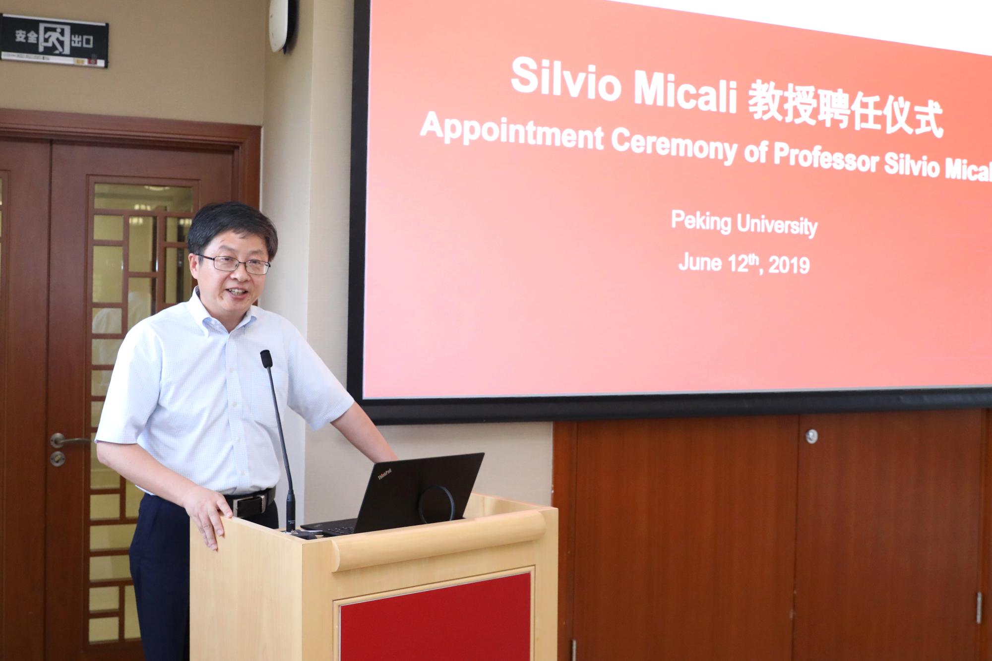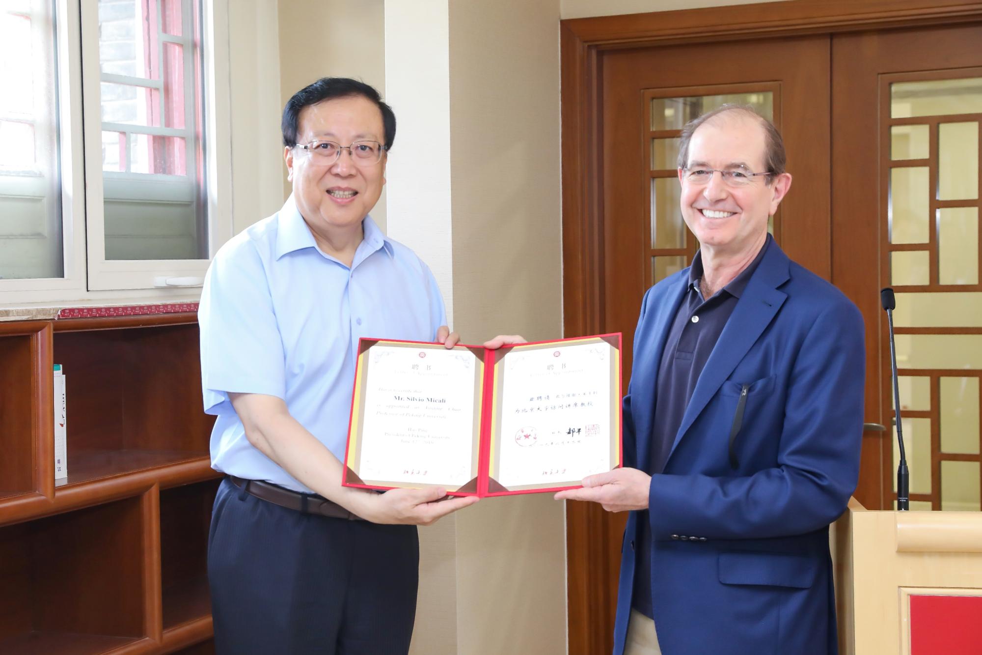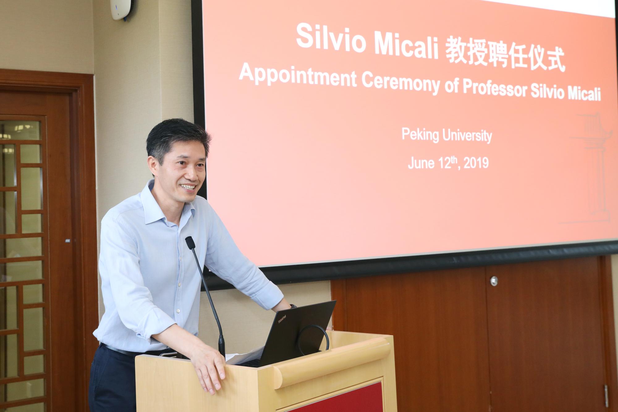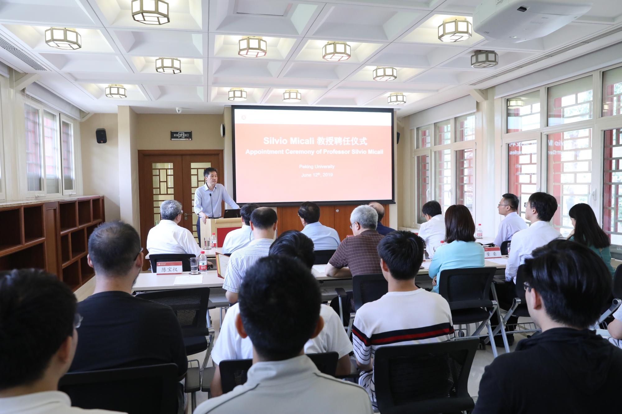 2019年6月12日,麻省理工学院Ford讲席教授、2012年图灵奖(A.M. Turing Award)获得者希尔维奥·米卡利(Silvio Micali)教授北京大学聘任仪式暨学术讲座在静园五院204会议室举行。北京大学校长郝平为米卡利教授颁发北京大学访问讲席教授聘书。来自信息学院、数学科学学院等单位的近百名师生参加讲座并见证聘任仪式。活动由前沿计算研究中心执行主任陈宝权教授主持。