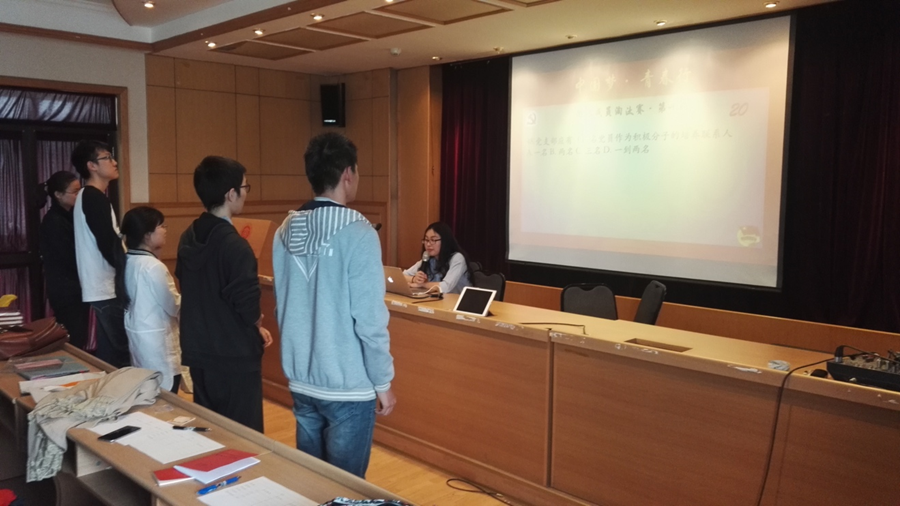 党的知识培训班共50余名学员,分5支队伍参加比赛。此次比赛共分为3轮,涉及党章、党史、中央文件、习近平总书记系列讲话等重要知识点。第一轮是团队成员淘汰赛。五支队伍分别派一名队员上场,轮流答题,在这一轮中“人民的名义队”赵广洋同学表现优秀,替“人民的名义队”首先拿到了决赛的入场券。