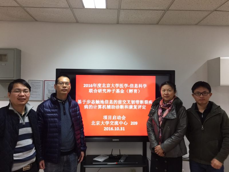 2016年10月31日,北京大学医学-信息科学联合研究种子基金2016年度资助项目“基于步态触地信息的前交叉韧带断裂疾病的计算机辅助诊断和康复评定”启动会在北京大学交流中心209会议室举行。会议由项目联合负责人李文新教授(北京大学信息科学技术学院网络与信息系统研究所)和黄红拾副主任医师(北京大学第三医院运动医学研究所)共同主持。