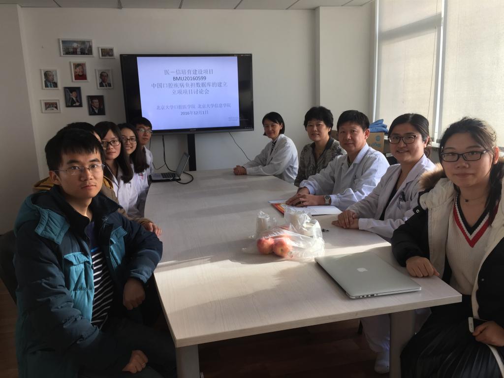 2016年12月1日,北京大学医学-信息科学联合研究种子基金2016年度资助项目“中国口腔疾病负担数据库的建立”启动会在北京大学口腔医院口腔预防保健科718会议室举行。会议由项目联合负责人之一、北京大学口腔医院口腔预防保健科张珊珊主治医师主持,科主任郑树国教授、副主任刘雪楠副研究员,项目组部分研究生成员出席。