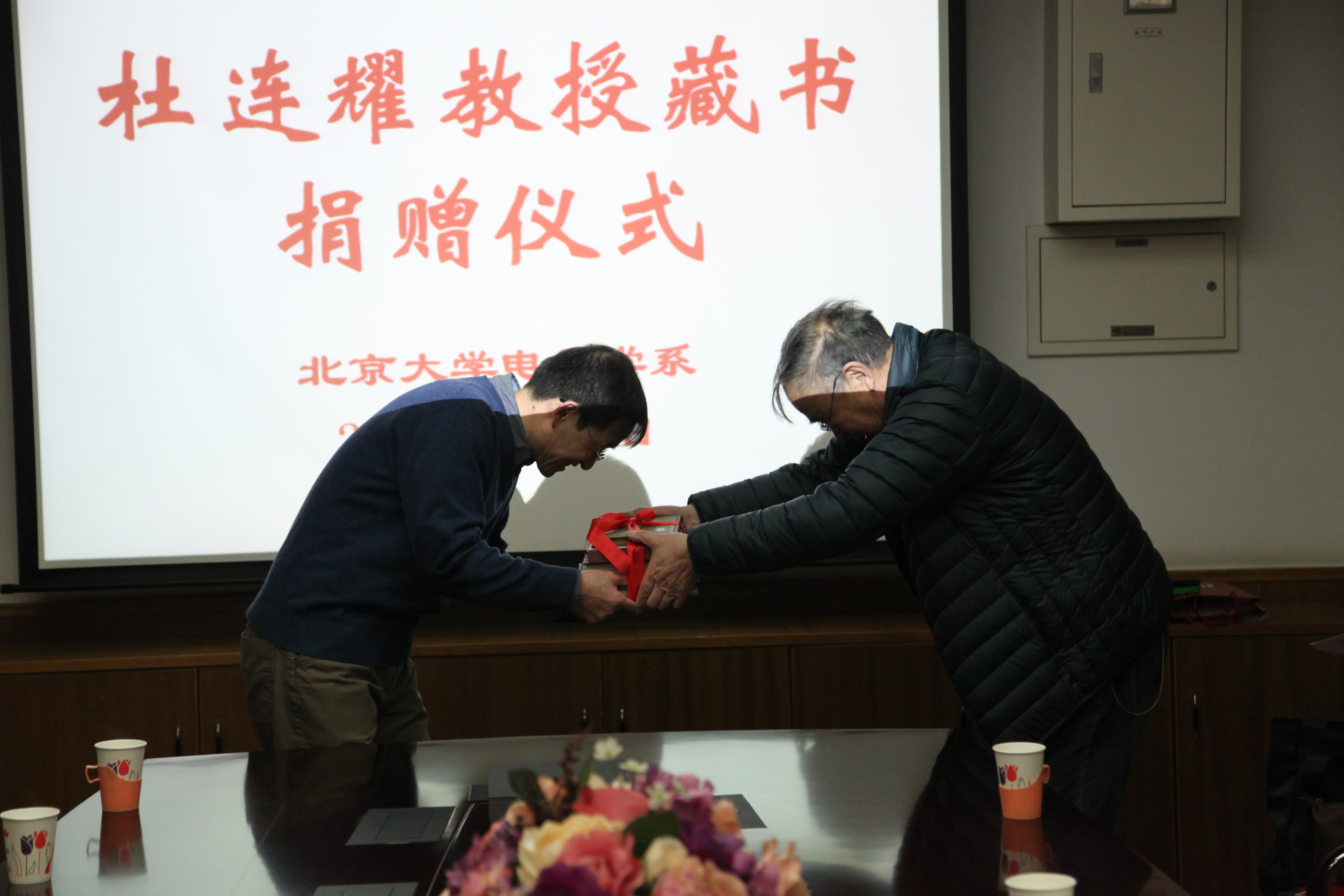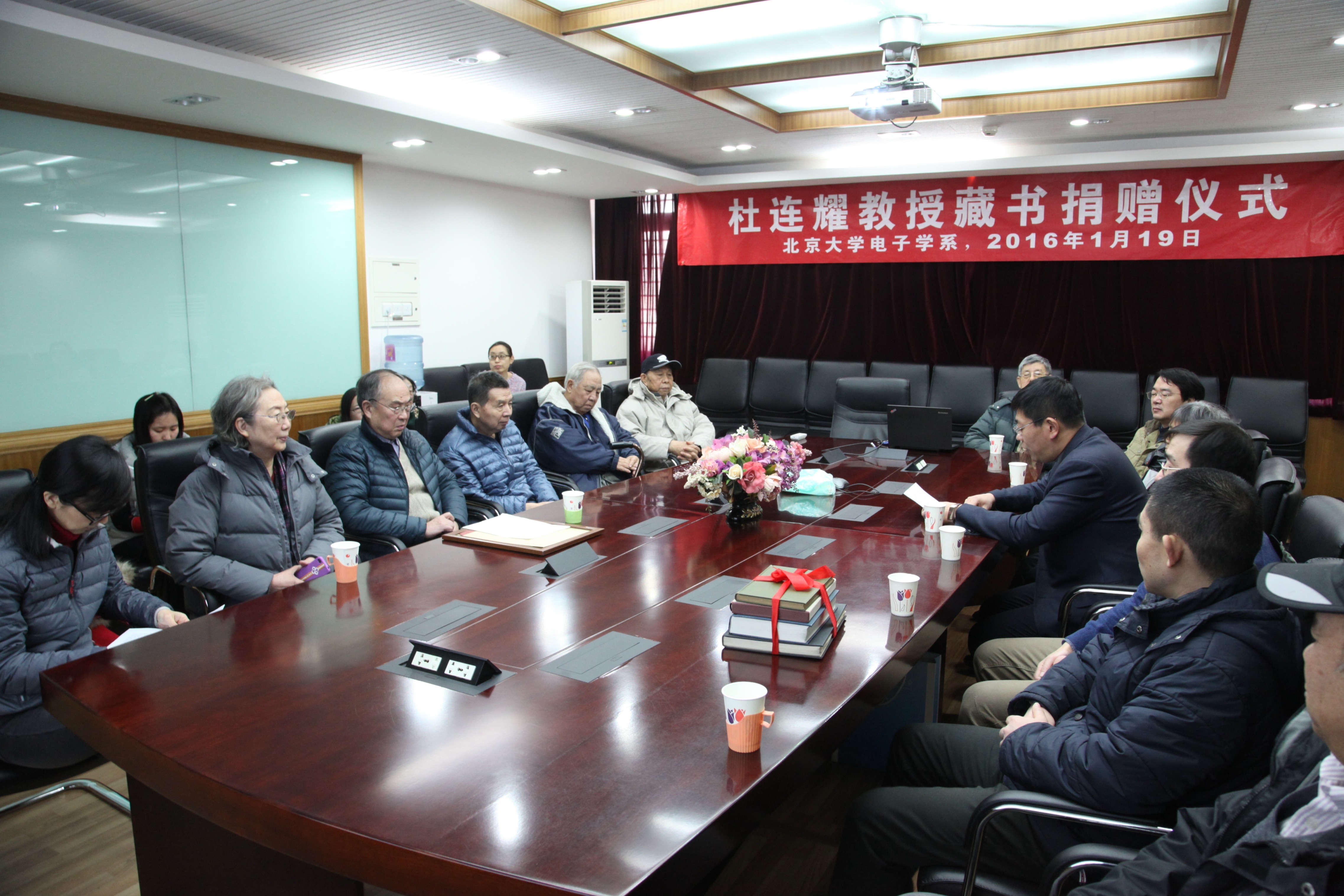 2016年1月19日,北京大学信息科学技术学院电子学系已故教授杜连耀藏书捐赠仪式在理科二号楼2420会议室举行。杜连耀教授的哲嗣杜森先生、次女杜俐女士向北京大学捐赠了毕生收藏的珍贵图书和文献资料。北京大学信息科学技术学院党委书记魏中鹏,电子学系原系主任项海格教授、原党委书记栾桂冬教授、副系主任姜天仕教授,原声学教研室王仁乾教授、吴全富、刘发臣、刘连博,原教务办公室主任赵伊丽,信息学院李朝晖副教授、综合办公室刘旭东副主任,以及相关专业师生等近二十人出席捐赠仪式。仪式由北京大学图书馆信息学院分馆负责人宋今主持。