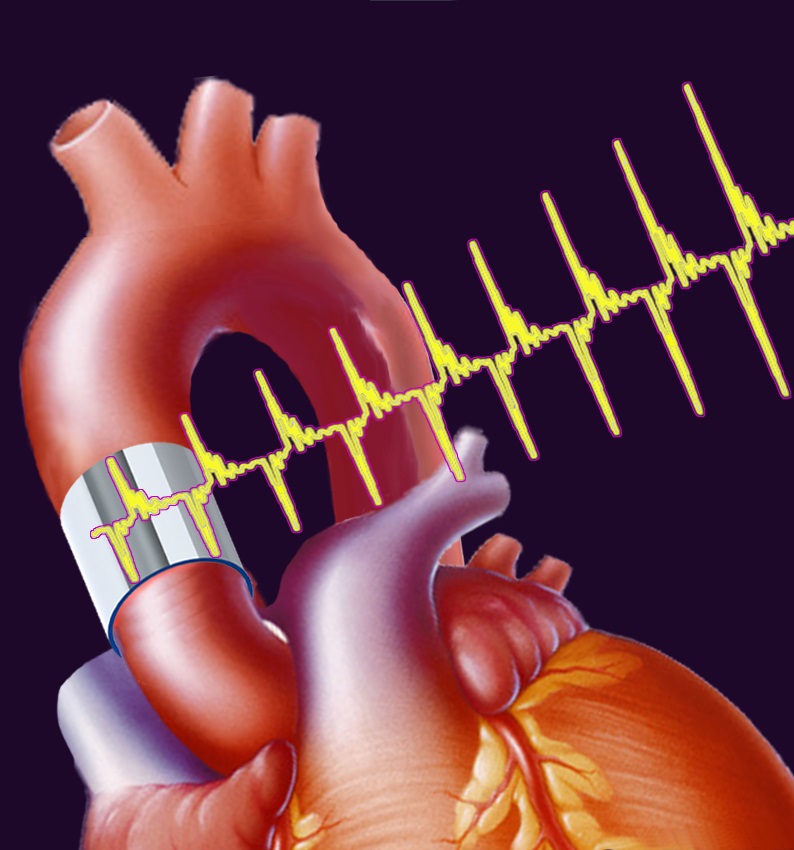 信息科学技术学院张海霞教授课题组与中国人民解放军第二军医大学附属上海长海医院张浩博士课题组在心血管能量采集领域长期合作,提出了采用条带状聚偏氟乙烯(PVDF)薄膜环绕心脏升主动脉,构成压电式微型发电机,用来采集心脏搏动收缩过程中所产生的机械能并转化为电能的植入式微型能量采集器。