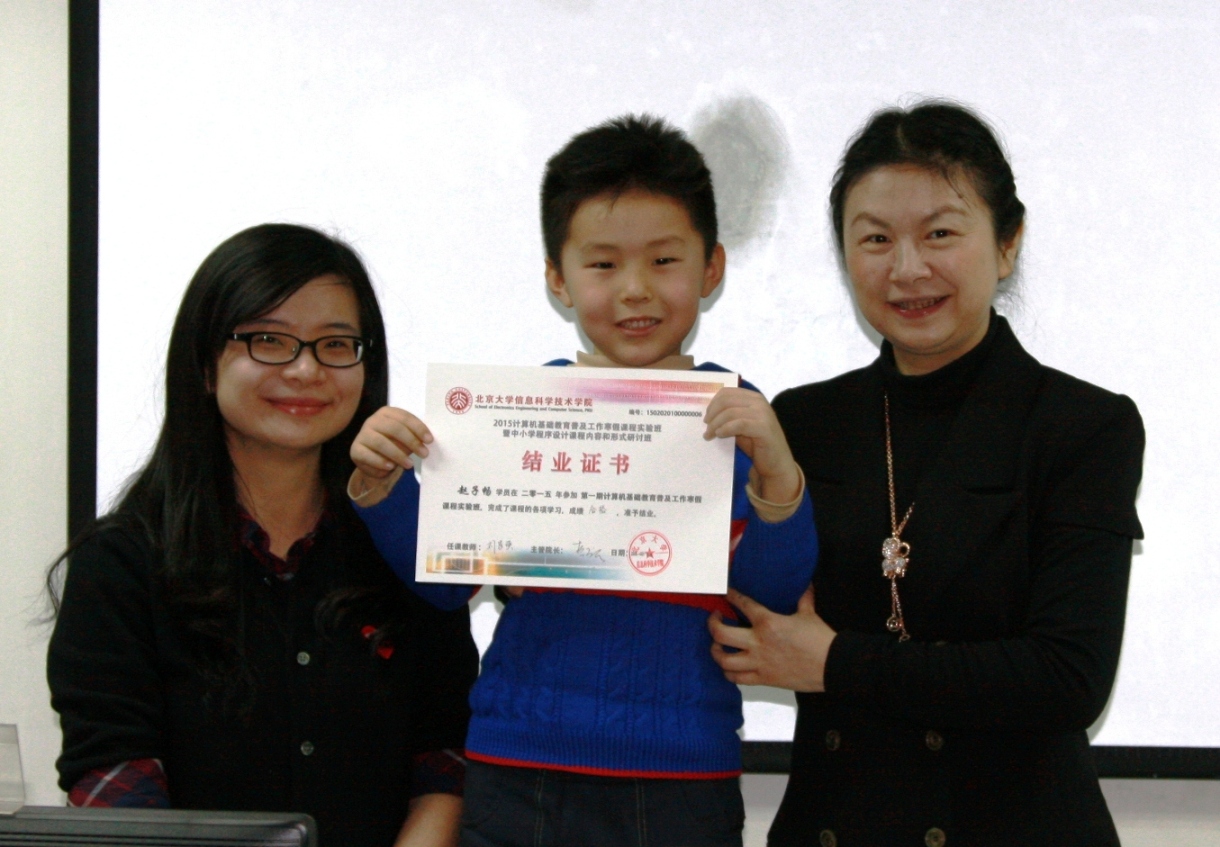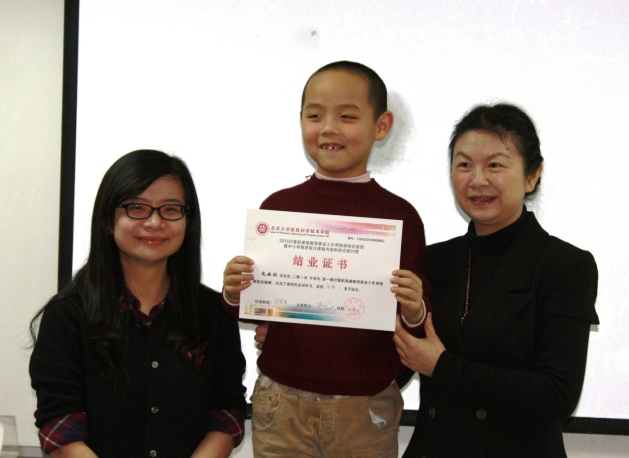 2015年2月8日北京大学信息科学技术学院“第一期计算机基础教育普及工作寒假课程实验班”小学段的七位同学经过7天的学习,顺利完成了课程的各项内容。这些学员虽然只有6、7岁,但在这几天的学习中都能认真听讲,独立完成作品的构思、制作与展示,并进行讲解。