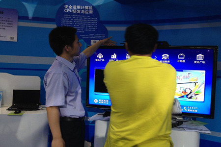 北京大学微处理器研发中心的云电视参加了本次科技展。云电视产品是面向三网/4C融合应用领域,以北大众志自主CPU为核心的新一代信息终端。采用北大众志自主创新的CPU产品,单芯片集成了传统计算机的全部功能(用于集散功能的1.5GHz主频CPU、用于2D/3D图形处理的1.0GHz主频GPU、全格式视频编解码处理的VPU和计算机南桥/北桥设备控制的完整模块),通过与国内软件厂商的电视业务服务商的合作,操作系统和应用软件也实现了国产化。充分体现了数字信息终端产品“以计算机技术为平台、以通信技术为纽带、以消费类电子为产品形态”的发展趋势。