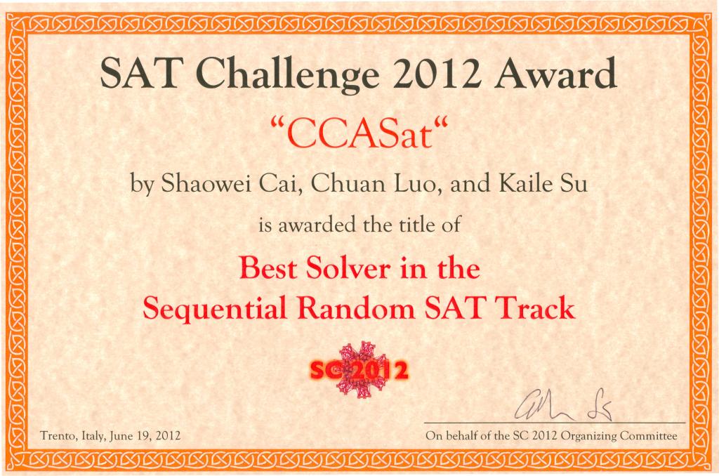 2012年6月19日,第15届可满足性测试的理论与应用国际会议(SAT 2012)在意大利举行。其间,揭晓了布尔可满足性问题求解挑战赛(SAT Challenge)的比赛结果。北京大学信息科学技术学院软件研究所苏开乐教授指导的博士生蔡少伟等人设计的求解器CCASat在随机组给出的600道挑战性难题解出了其中的70.5%,夺得该组第一名。这是亚洲国家和地区在SAT会议主办的可满足性问题求解系列比赛中所取得的首个冠军。