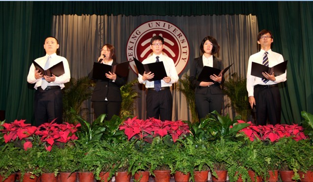 毕业生代表朗诵了《永远的校园》,并向教师代表敬献了鲜花,表达感激之情。毕业生典礼在《燕园情》优美的歌声中圆满结束。