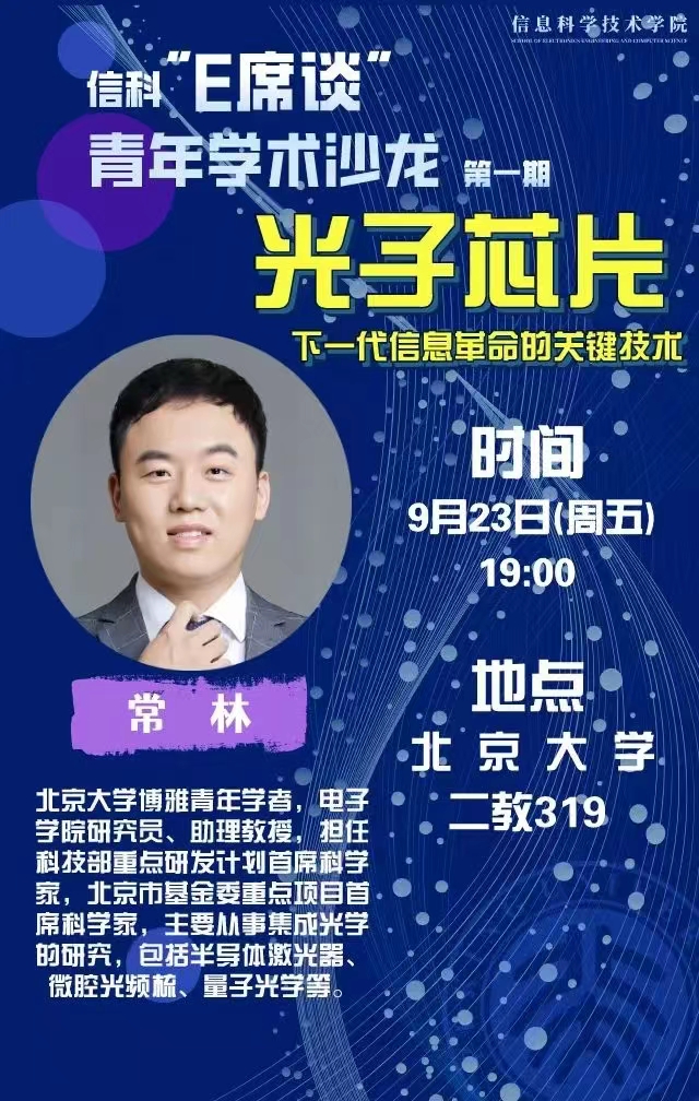2022年9月23日晚7点,由信息科学技术学院主办的“信科E席谈”青年学术沙龙首期活动在第二教学楼319教室顺利举办。北京大学博雅青年学者,电子学院研究员、助理教授常林老师受邀进行以“光子芯片——下一代信息革命的关键技术”为主题的报告。约80名师生参加了活动。首期沙龙由学院副院长王润声老师担任交流互动环节的评议人,学院团委书记吕媛主持活动。