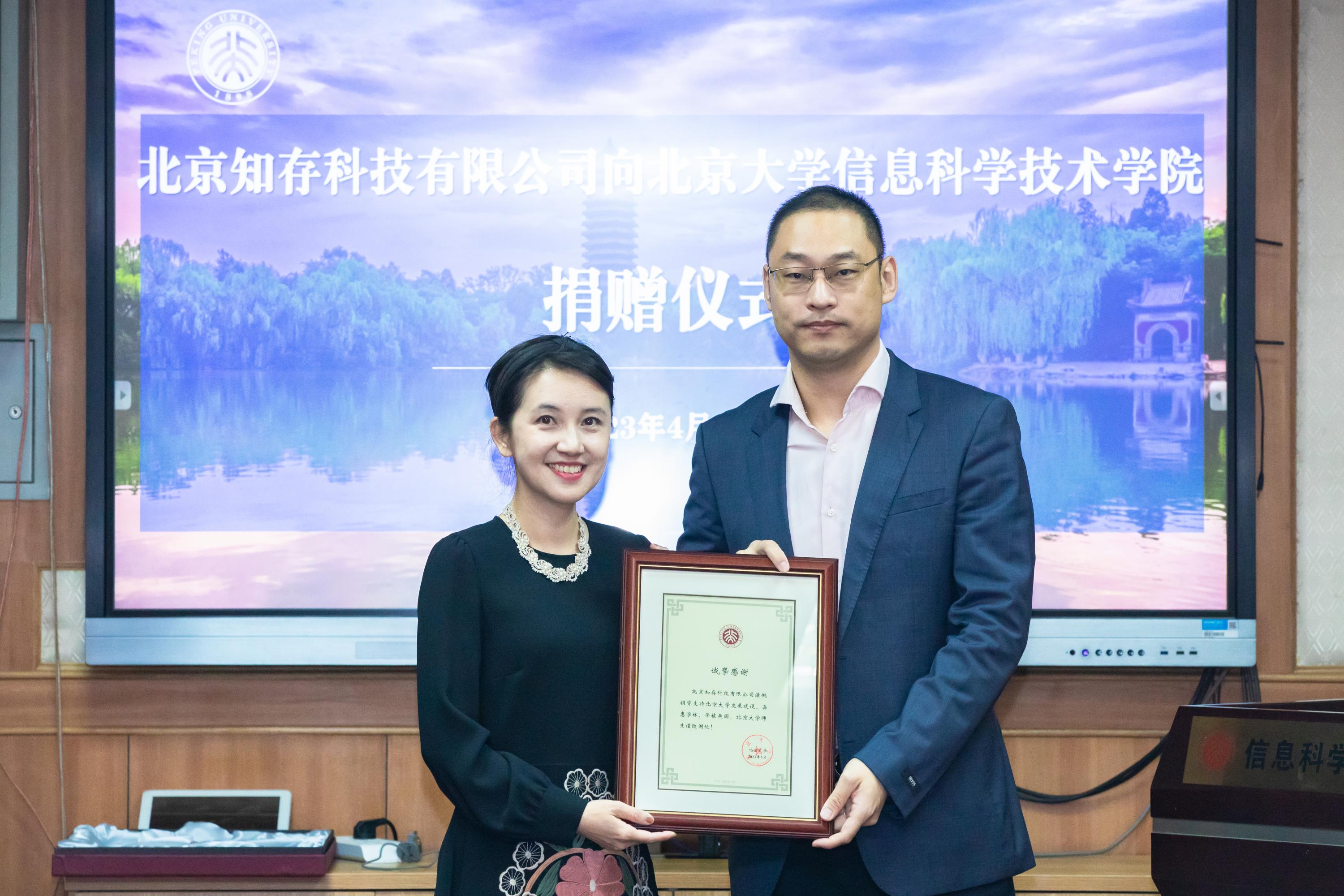 4月28日下午,在北京大学即将迎来建校125周年之际,北京知存科技有限公司向北京大学信息科学技术学院捐赠仪式在理科二号楼2111会议室举行。由北京大学信息科学技术学院2007级校友王绍迪创办的北京知存科技有限公司捐资支持信息科学技术学院发展项目,用于对学院人才培养、队伍建设、讲座交流等方面的支持,助力信科建设“世界一流、中国特色、北大风格”的新工科创新型人才高地。