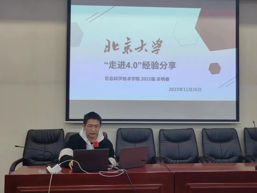 2023年11月26日上午,信息科学技术学院学生会“走进4.0”学术交流讲座活动于理科二号楼2129报告厅成功举办。2022级图灵班李新年同学、2022级智班于旻扬同学、2022级信班吴明睿同学、2022级信班周子瑄同学等四名分享同学与部分2023级新生共同参与本次活动。信息科学技术学院学生会学术部负责人宋海博同学主持本次活动。