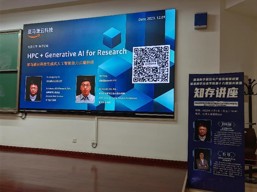 2023121日晚,信息科学技术学院第十九期“知存讲座”暨信息科学前沿与产业创新课程在北京大学理科教学楼208教室顺利举办。曾任中科院物理研究所副研究员,现任亚马逊云科技高等教育行业总监的刘东屏教授和亚马逊云科技资深解决方案架构师石锋老师受邀进行了以“亚马逊云科技生成式人工智能(GenAI)助力云端科研”为主题的分享,400余名师生到场聆听;信息科学技术学院副院长王润声教授主持了本次活动;亚马逊云科技的朱耀飞、乔敬霄、李亦钊等现场支持本次活动,并参与了学生问题的解答。