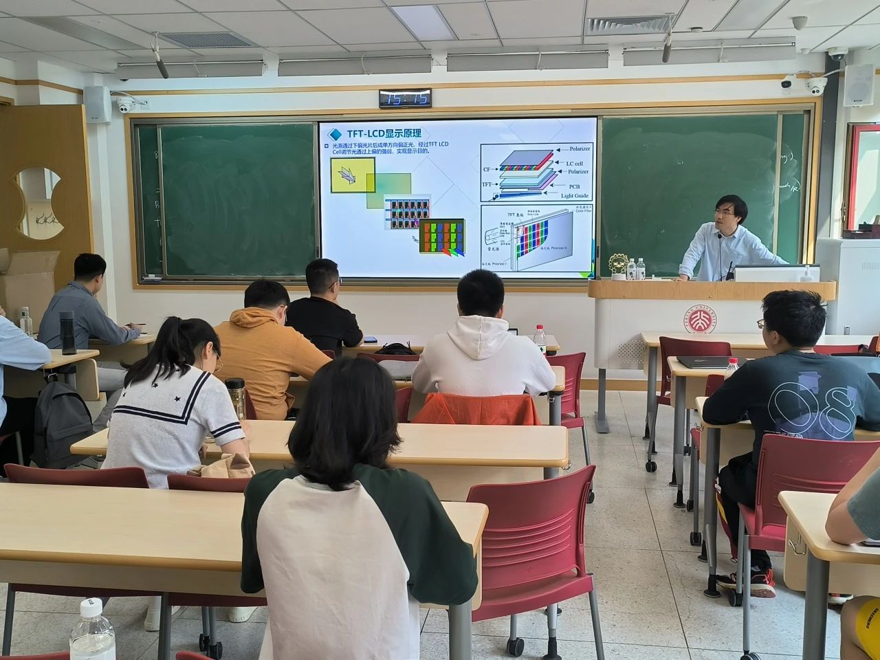 2024年4月8日,由北京大学信息科学技术学院、电子学院、碳基电子学研究中心联合举办的显示技术系列讲座第5期——“大尺寸LCD显示画质提升技术”在北京大学一教207顺利举办。本次讲座由北京大学电子学院康佳昊研究员主持,特别邀请到了来自TCL华星光电深苏产品研发中心的中心长杜鹏进行精彩的演讲。
