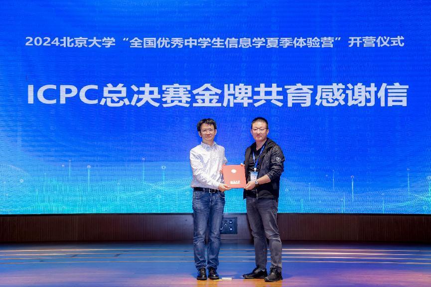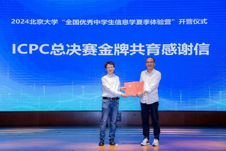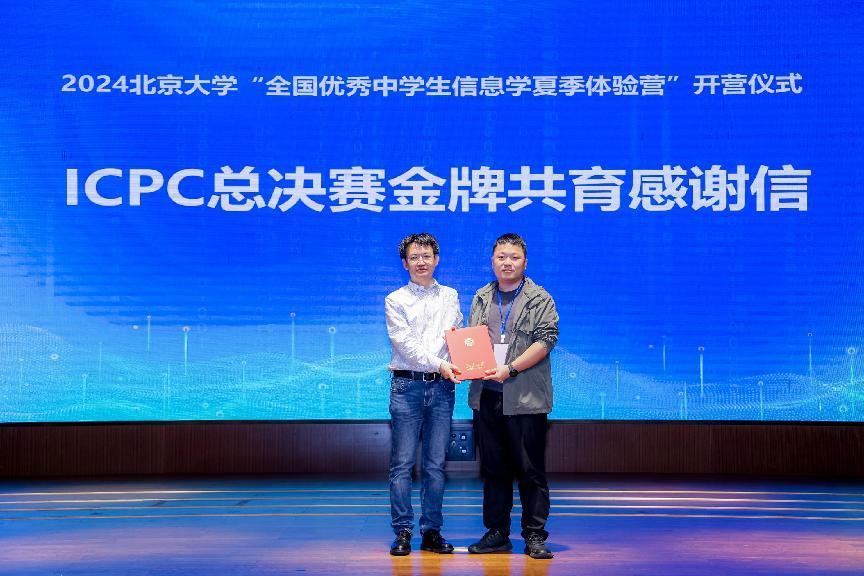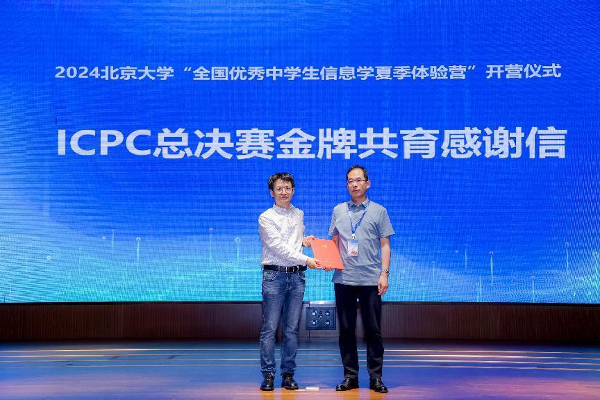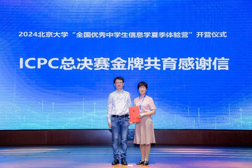 近期,在埃及卢克索举办的国际大学生程序设计竞赛全球总决赛(ICPC World Finals)中,北京大学两支代表队凭借其出色的发挥,连续斩获第46届ICPC WF冠军、第47届ICPC WF亚军,创造了北大算法与程序设计领域新的里程碑。北大代表队中的优秀本科生是北京大学和优秀中学共同的育人成果。仪式上,陆俊林代表学院宣读了ICPC总决赛金牌队伍所在中学教练的感谢信。侯士敏为绍兴市第一中学陈合力老师、西南大学附属中学校潘玉斌老师、宁波市镇海中学符水波老师、广州大学附属中学王晓鹏老师、四川省成都市石室中学曾贵胜老师等五位教练代表颁发共育感谢信,籍此感谢全国各中学参与信息学学生培养的老师和教练们的辛勤工作和心血投入。