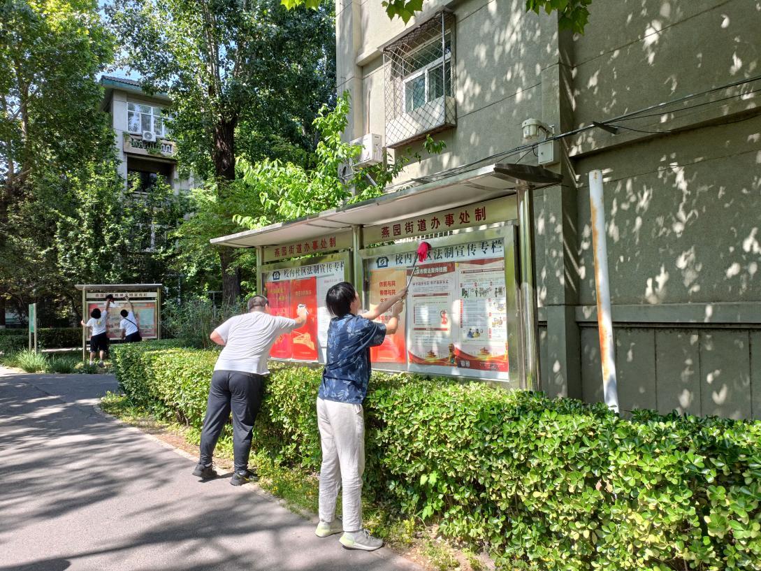 同学们的任务主要分为两部分,一部分同学负责清洁社区公告栏、宣传栏以及社区公共基础设施,另一部分同学负责清理路面、湖边以及草丛中的垃圾。天气十分炎热,但同学们劳动的热情都十分高涨。