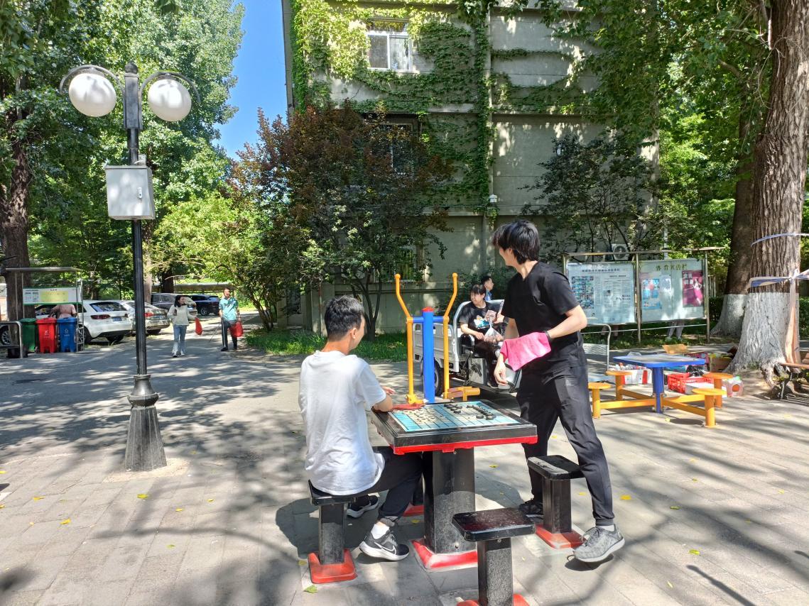 清洁社区公共基础器材,以及社区干部向同学介绍垃圾分类