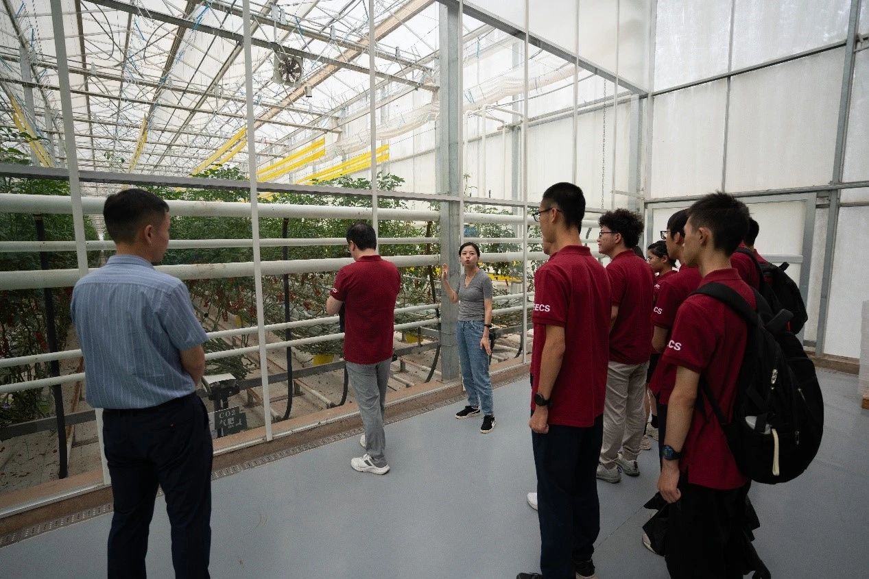 在讲解员的带领下,大家来到温室实地调研现代化农业技术的应用情况。实践团参观了环境监控、自动水肥灌溉控制、品质检测等设备,初步了解了种植、采摘、检测、包装全过程,并积极提问无土栽培与水肥灌溉技术细节、樱桃番茄的生长周期与采摘周期、樱桃番茄品质检测标准等。