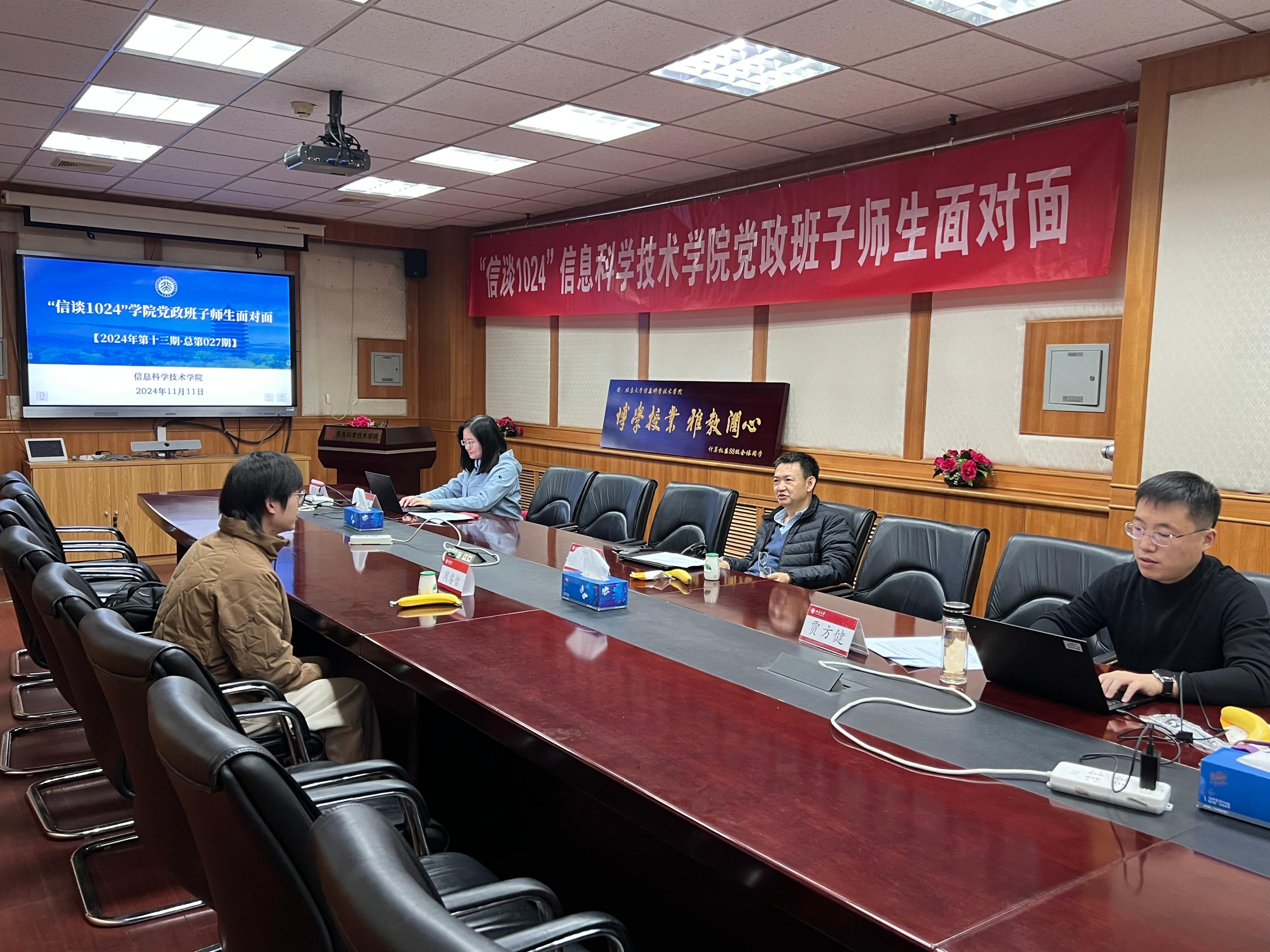 20241111日中午,信息科学技术学院在理科二号楼2111会议室举办2024年第十三期(总第27期)“信谈1024”学院党政班子师生面对面之深造和就业专题活动,本次座谈会采取个人单独面谈的形式,对报名同学们的问题依次答疑解惑。院长侯士敏、党委副书记贾方健,成功报名的学生们参加了本次面谈。活动由学院学工办主任李子奇主持。