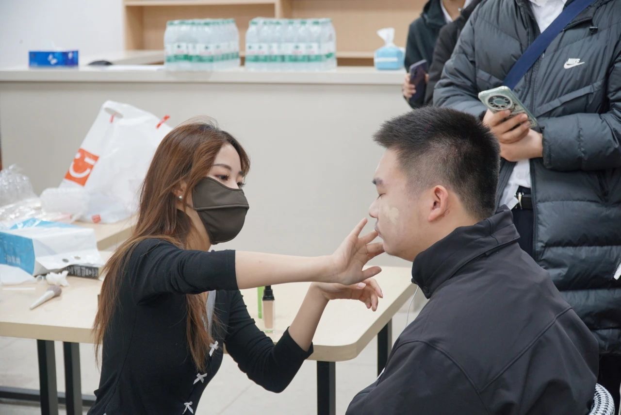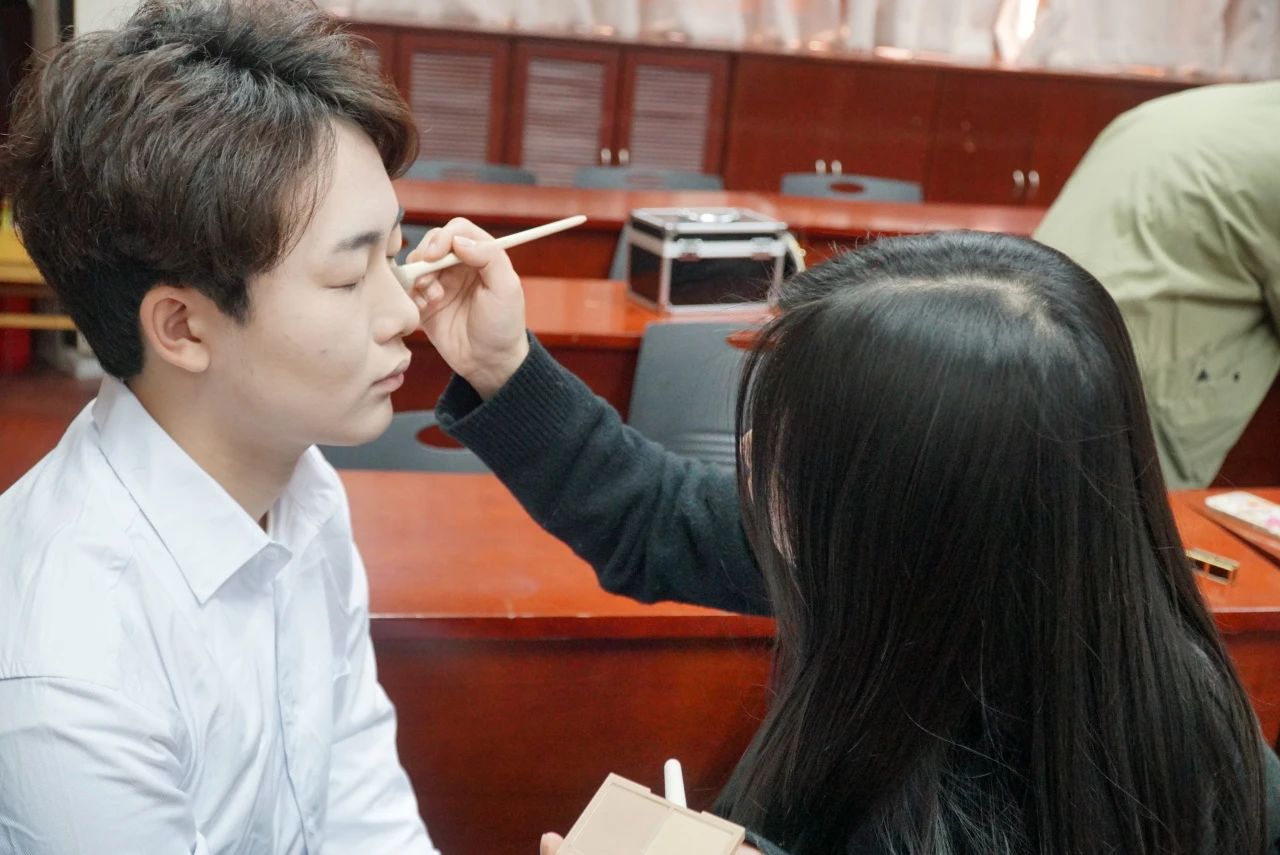 中午短暂的休整过后,小狮子们前往1127、1131教室,进行化妆工作。在化妆开始前半小时,后勤组同学已经安排好化妆的流程、位置和人员,静候同学们到来。信科代表队人数众多,化妆工作艰巨,但由于组织工作细致到位,大家得以有序穿梭于各个化妆位之间,从底妆、修眉,到眼妆、眉妆,再到修容、腮红高光,一个个精致的舞台妆在心灵手巧的志愿者手中诞生,大家你看看我,我看看你,女生个个粉妆玉琢,男生也是有鼻子有眼睛,大家相视一笑,都对志愿者们高超的化妆技艺赞不绝口,并对她们负责和高效的付出表示感谢。与此同时,后勤组的同学们正在紧锣密鼓地进行演出服装的调换,力求保证大家都能以最合身的服装、最饱满的热情登台表演。