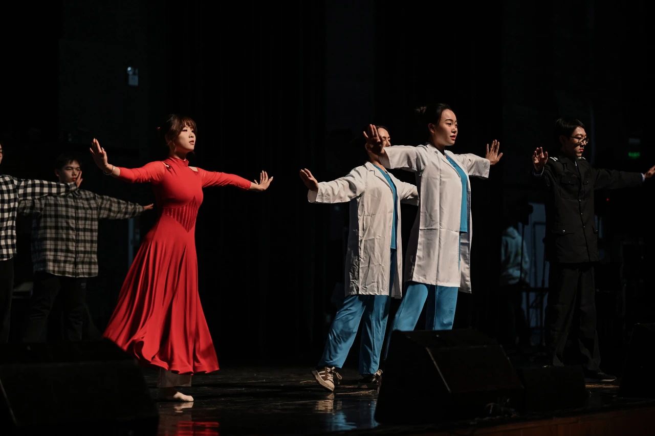 灯光暗场,小狮子们和学院党委书记严敏杰、院长侯士敏、副院长邓斌、党委副书记贾方健一同站上舞台。尽管在排练中已经无数次听过那熟悉的开场伴奏,但当《最美的相约》的旋律在钢琴与小提琴的协奏中缓缓响起时,每个人的内心仍然无法抑制地澎湃起来。在这一刻,所有的紧张和焦虑都化为力量,小狮子们准备以最佳的状态,展现他们最精彩的表演。舞台组的同学们扮演了社会上的多种角色,每个身份都彰显了他们对社会的深切关怀和对责任的承担,这些年轻的社会工作者用他们的行动和热情,为抗击疫情贡献了自己的力量,同时也为青春的画卷增添了浓墨重彩的一笔。他们的故事,如同一首激昂的进行曲,激励着我们每一个人。小狮子们唱出了青春的坚韧和不屈,唱出了在逆境中成长的力量。每一次的援助,每一次的奉献,都是对未来的坚定承诺,都是对青春价值的最好诠释。