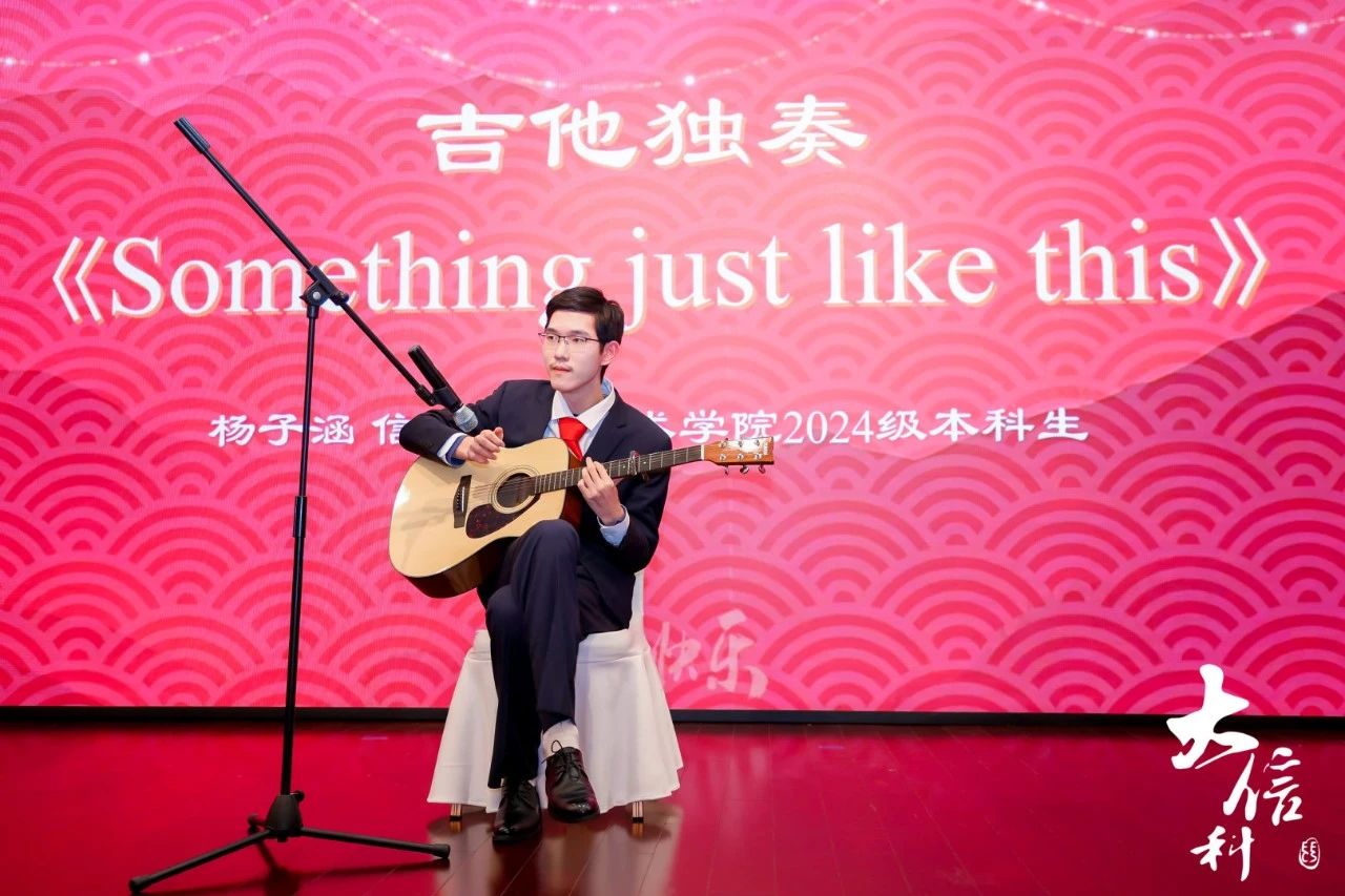 桑钰超同学演唱的《悟空》,独特的嗓音很好地诠释出歌曲中的沧桑感和悟空的英雄气概,将歌曲中的复杂情感表达得淋漓尽致,张立儒同学的吉他独奏《Libra Sonatine: III. Fuoco》,每一个音符都充满了情感和力量,而杨子涵同学带来的吉他独奏《Something just like this》,更是拥有充盈的情绪。夏中豪同学带来的歌曲《青火》蕴含着青年人对未来的思考以及对梦想的执着。