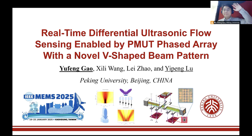 近日,第38届微纳机电系统国际大会(IEEE International Conference on Micro Electro Mechanical Systems, IEEE MEMS 2025)在中国台湾落下帷幕。北京大学信息科学技术学院2021级本科生高毓风在该会上作为第一作者展示了论文 Real-time Differential Ultrasonic Flow Sensing Enabled by PMUT Phased Array with a Novel V-shaped Beam Pattern (《基于压电微机械超声换能器相控阵所产生新型“V”字型声场的实时差分流速传感》)。此篇文章打破既往对于声学栅瓣的刻板认知,突破此前声学换能器间距设计的半波长限制,开创性地利用多通道换能器相位优化控制实现了对称的“V”字型声场,并将其应用于拥有广阔应用前景的流量监测,解决了超声流量计在高精度流量监测中的实时性问题。该文章内容受到大会科技委员会的高度认同,获得此届大会“最佳学生论文奖”的提名(Outstanding Student Paper Nominee)。这也是高毓风连续第二年在该微纳机电系统领域的国际顶级学术会议以第一作者身份发表文章。该文章的通讯作者为集成电路学院的卢奕鹏老师。
