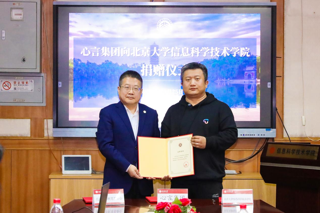 4月25日下午,心言集团向北京大学信息科学技术学院捐赠仪式在燕园校区理科二号楼2111会议室举行。心言集团捐资支持信息科学技术学院发展项目,用于对学院人才培养、创新实践、学术交流等方面的支持,助力信科学院建设“世界一流、中国特色、北大风格”的新工科创新型人才高地。