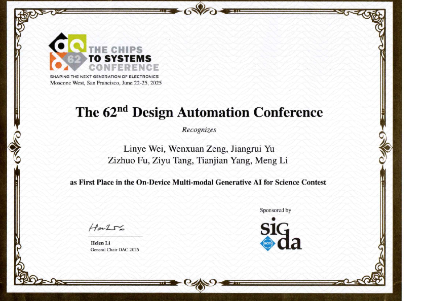 在2025年第62届ACM/IEEE设计自动化大会(DAC)系统设计竞赛中,北京大学人工智能研究院和集成电路学院双聘助理教授李萌老师指导的学生队伍获得冠军。参赛学生包括来自集成电路学院设计自动化与计算系统系的三位博士生韦临烨、曾文轩、俞江瑞和来自信息科学技术学院电子信息科学类实验班(信班)的三位本科生傅子酌、汤子瑜、杨天健。DAC系统设计竞赛由美国计算机学会(ACM)设计自动化专业委员会(SIGDA)赞助,竞赛组织者来自美国乔治梅森大学、北卡罗来纳大学教堂山分校和电子科技大学。本次比赛针对如何在低功耗边缘设备上部署多模态生成式人工智能算法的科学问题,吸引到了来自世界各地的参赛队伍,包括美国、中国、德国、荷兰等。