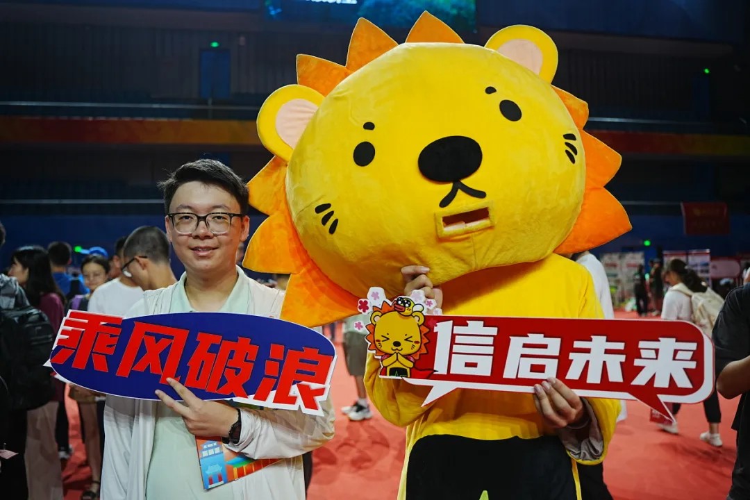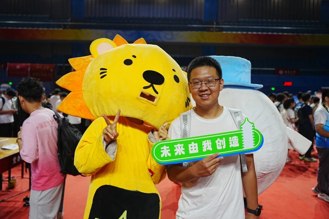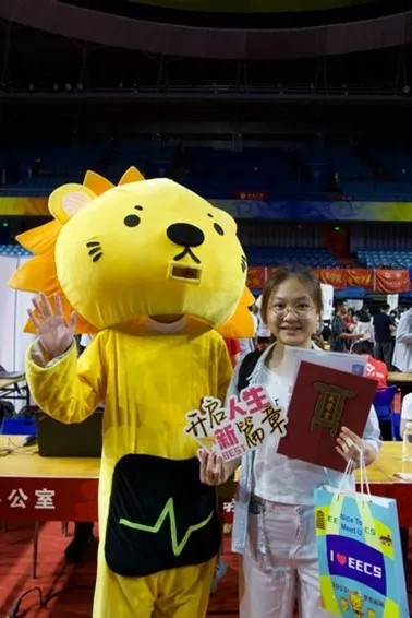 迎新现场,吉祥物天团齐上阵,最抢镜的仍是信科的“攻城狮”。憨态可掬的外表吸引着同学们的注意,新生纷纷与它排队合影,把第一张洋溢着青春活力的“北大信科认证照”收进口袋。