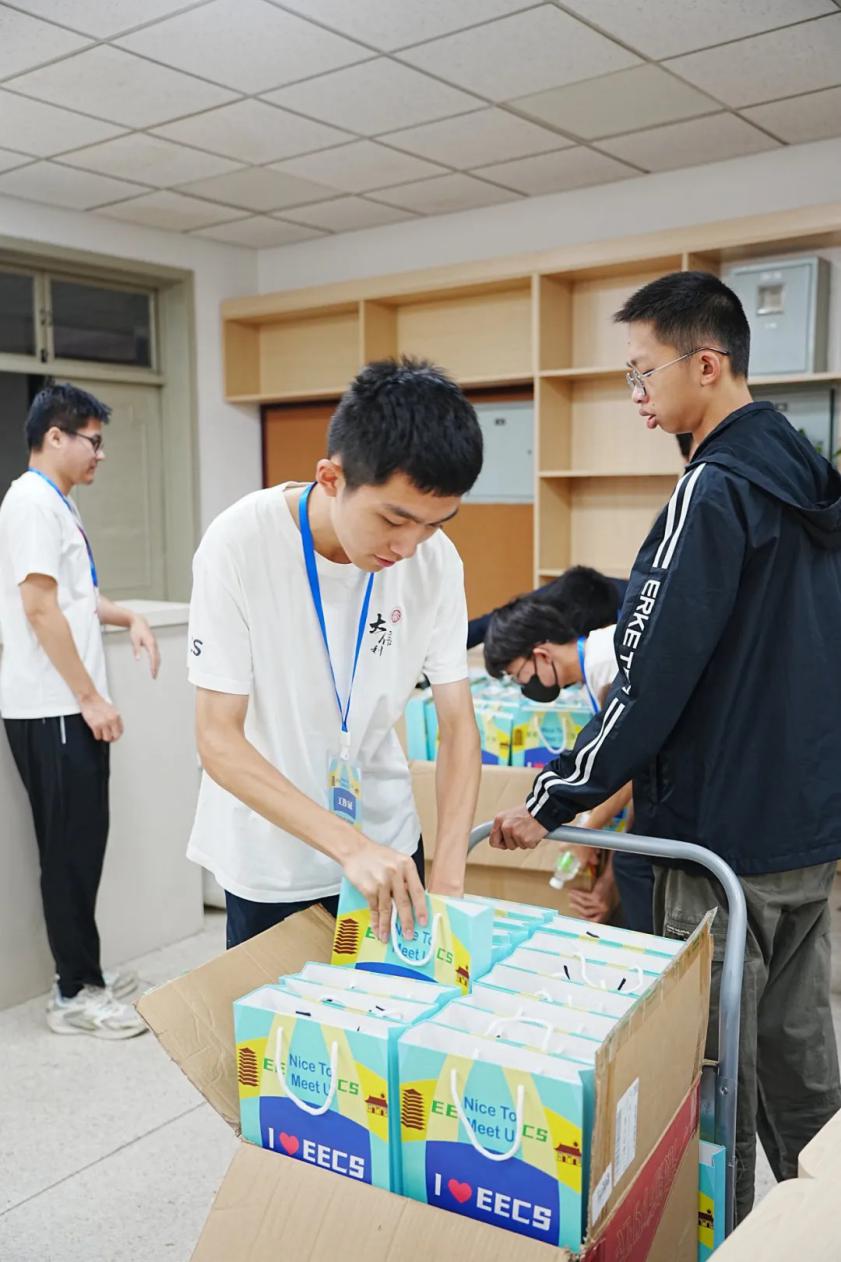 清晨六点,学院党政办、教务办、学工办、团委的老师们和志愿者们便在场馆中开始忙碌,一袋袋物资礼包整齐码放、井然有序,静候新同学佳音。