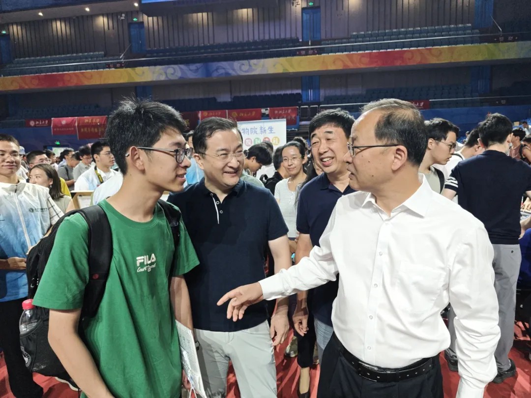 上午,北京大学党委书记何光彩、校长龚旗煌等来到学院迎新摊位,与新同学们亲切交流,向他们表示祝贺和问候,并对现场学院老师与志愿者表示慰问。